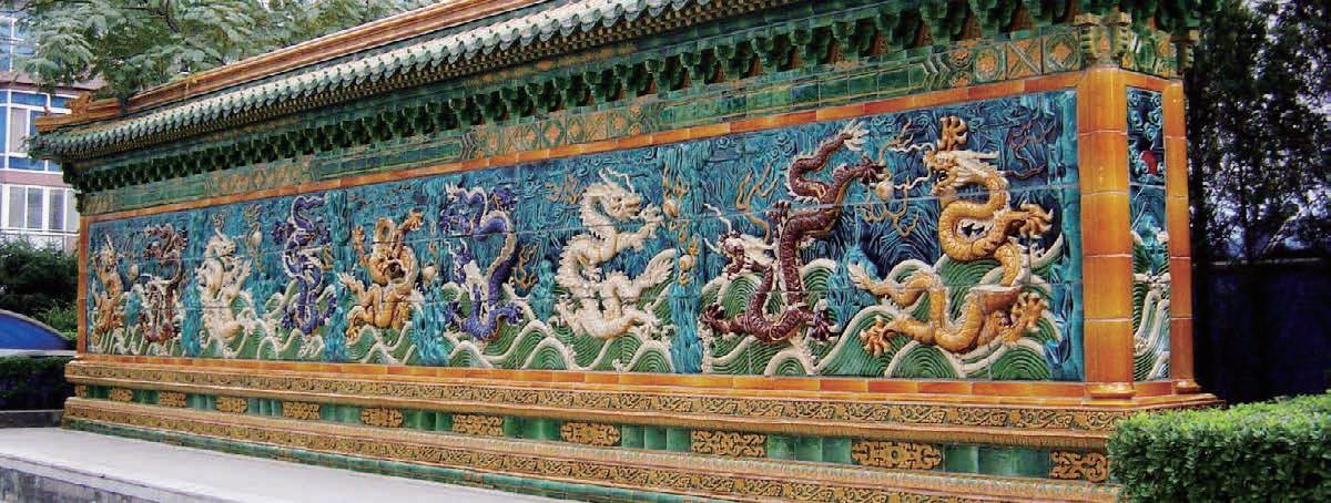 La imagen del dragón aparece en edi cios palaciegos chinos, en esculturas –la más famosa es el Muro de los Nueve Dragones–, en la indumentaria imperial –como la “capa del dragón”, túnica que vestía únicamente el emperador–, en la literatura, en la pintura, en la mitología y en los barcos. Además, está asociado al culto de Confucio.