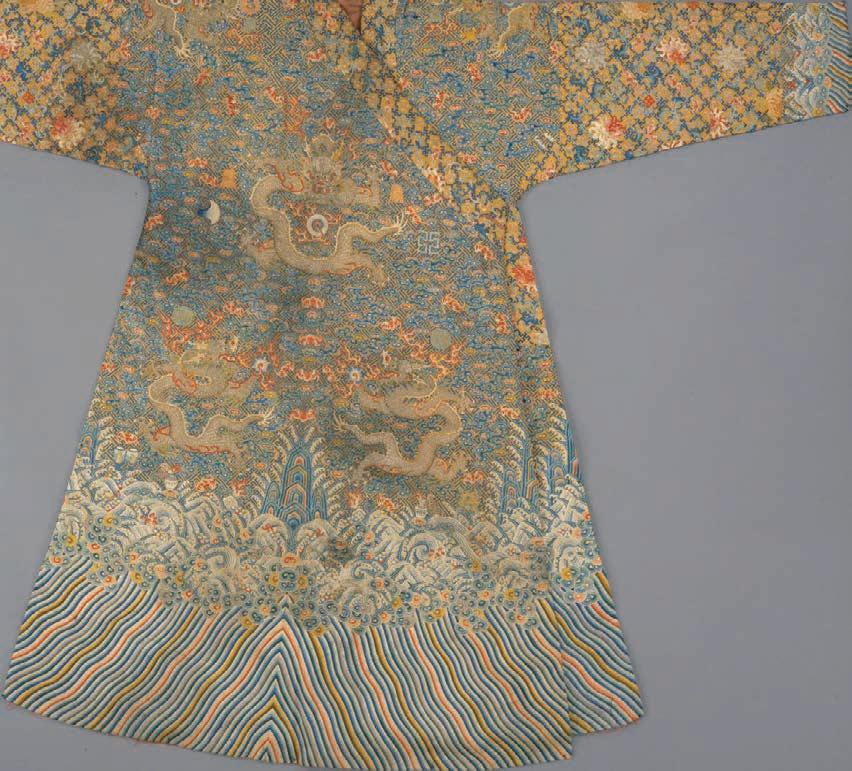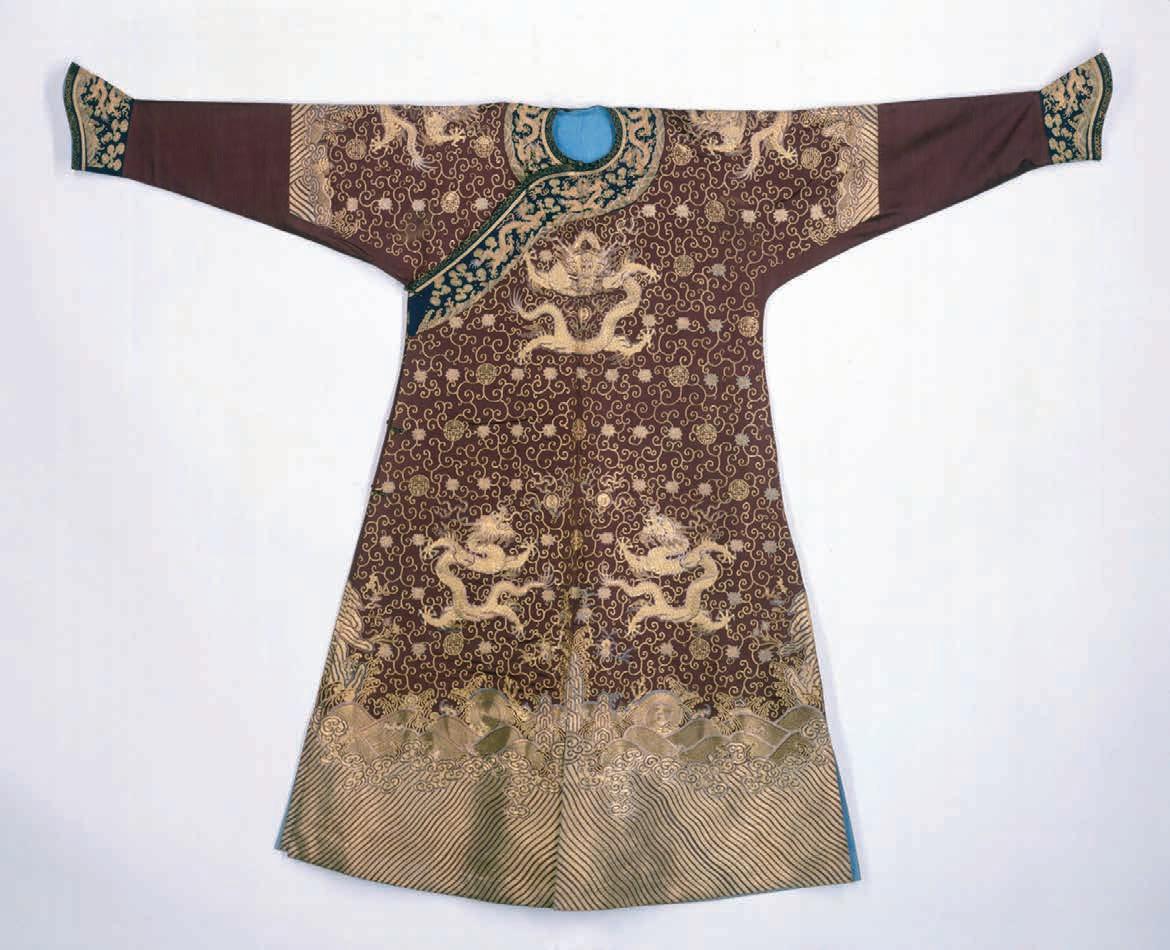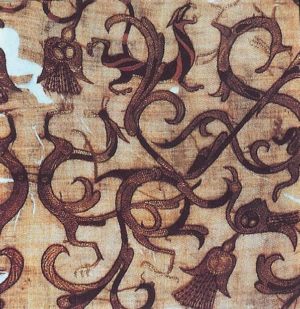 图 Detalle de un vestido ritual de seda bordada perteneciente al siglo IV a. C., hallado en una tumba de la época Zhou en Mashan, provincia de Hubei. El diseño incorpora aves fénix, dragones y tigres.
