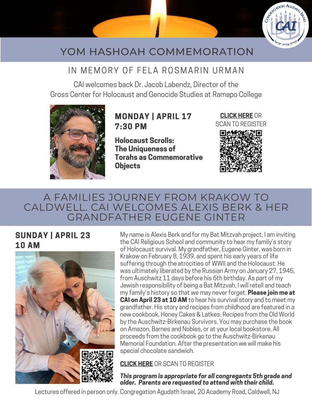 Each year the Men’s Club gives a college scholarship to a deserving high school senior based upon academic achievement, meaningful involvement in the community, and a personal essay. Applications are due by March 31, 2023. This year, Yom Ha-Shoah Holocaust Remembrance Day begins the evening of Monday, April 17; please light the memorial candle you received in your Purim basket that evening and recite the reading that came along with it. (If you did not receive a memorial candle, contact Jonathan Mehl.) Thank you to Steven Holinstat for organizing this annual ommemorative event. Please consider making a