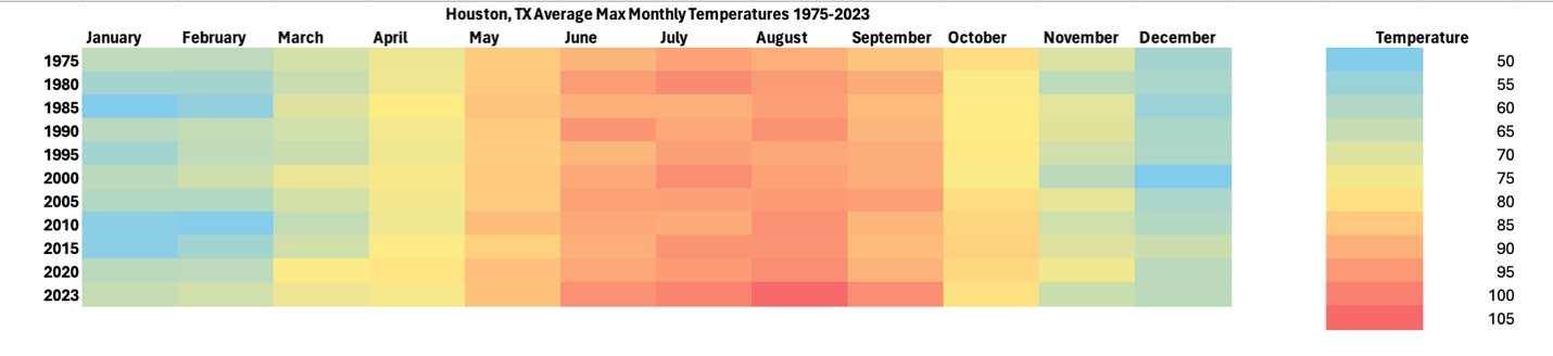 3 Heat maps were created using historical weather data. Data used were the average monthly maximum temperatures. from 1975 through 2023. All data points were placed into an excel file and then formatted to express the temperature changes. Blue and green represent cooler temperatures, with orange and red representing warmer temperatures.