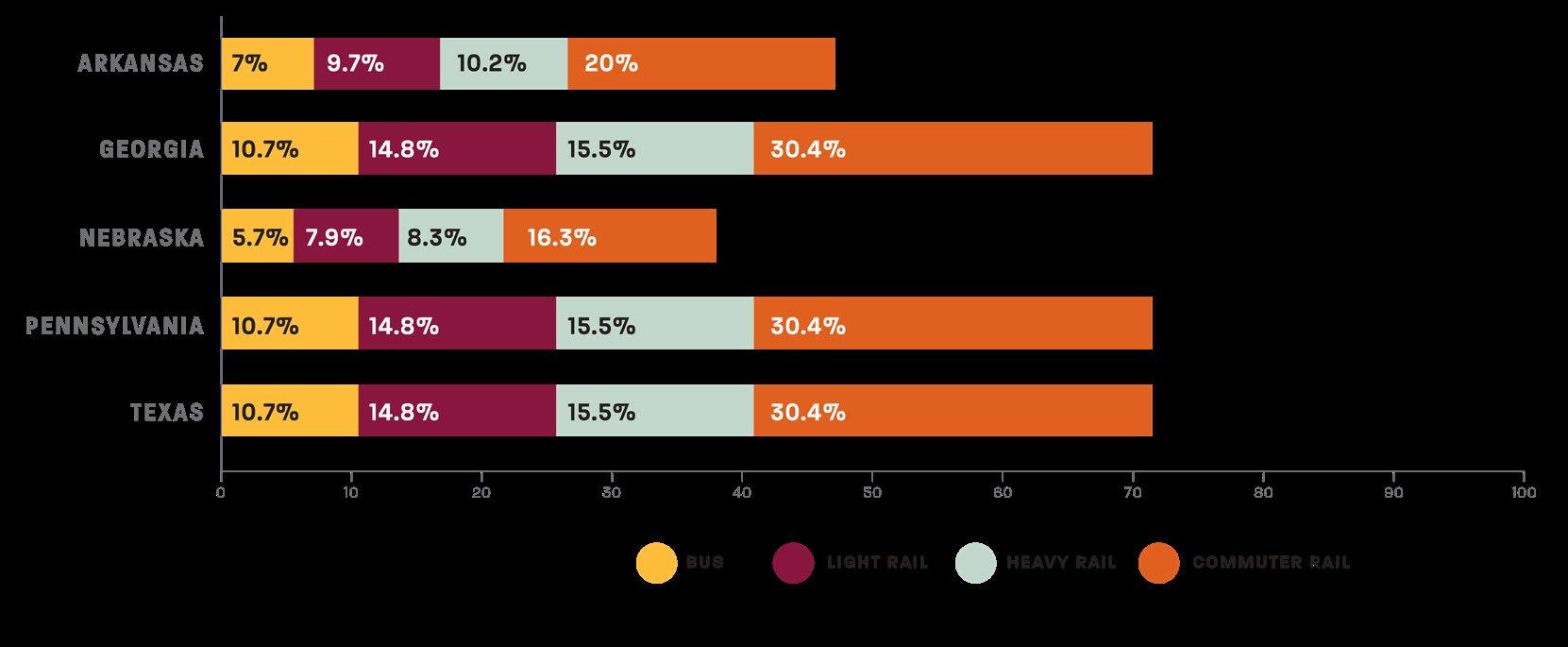 16 Kenny, S. (2023). Is your state missing the bus? Evaluating state transit access and ridership. Transportation for America. https://t4america.org/2023/05/03/is-your-state-missing-the-bus-evaluating-state-transit-access-and-rider ip/