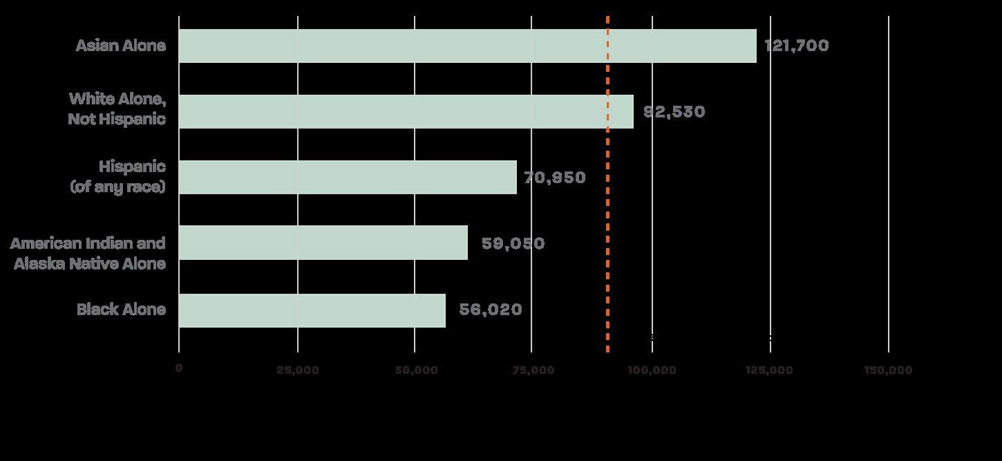 In 2024, the U.S. median household income was $83,730. Notably, Nebraska was the only state above the national average. 7 Overall, Asian households had the highest median household income among racial and ethnic groups at $121,700, while Black households had the lowest at $56,020 (Figures 2 and 3). 8 The wide income gap across states and racial groups, particularly the stark disparity between Asian and white versus Black households, highlights deep structural inequities that shape economic opportunity and financial stability nationwide.