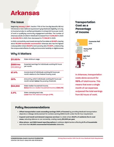 BeginningJanuary1,2027,Section71119oftheOneBigBeautifulBillActintroducesanew nationalrequirementtyingMedicaideligibilitynotonlytoincomebutalsotoverified participationinatleast80hourspermonthofworkorqualifyingcommunityengagement activities.Whileframedasapathwaytoeconomicself-sufficiency,thispolicyoverlooks thestructuralbarriersthatdeterminewhetherlow-incomeadults,especiallyBlack Americans,canrealisticallymeettheseobligations.Thisanalysisevaluateshowincome, unemployment,digitalaccess,andtransportationaffordabilityshapethefeasibilityof meetingthisnew80-hourworkrequirementacrossfivestates:Arkansas,Georgia, Nebraska,Pennsylvania,andTexas.Withoutaddressingtransportationanddigital access,theseworkrequirementswillserveasacoveragefilterratherthanaworkforce strategy.
