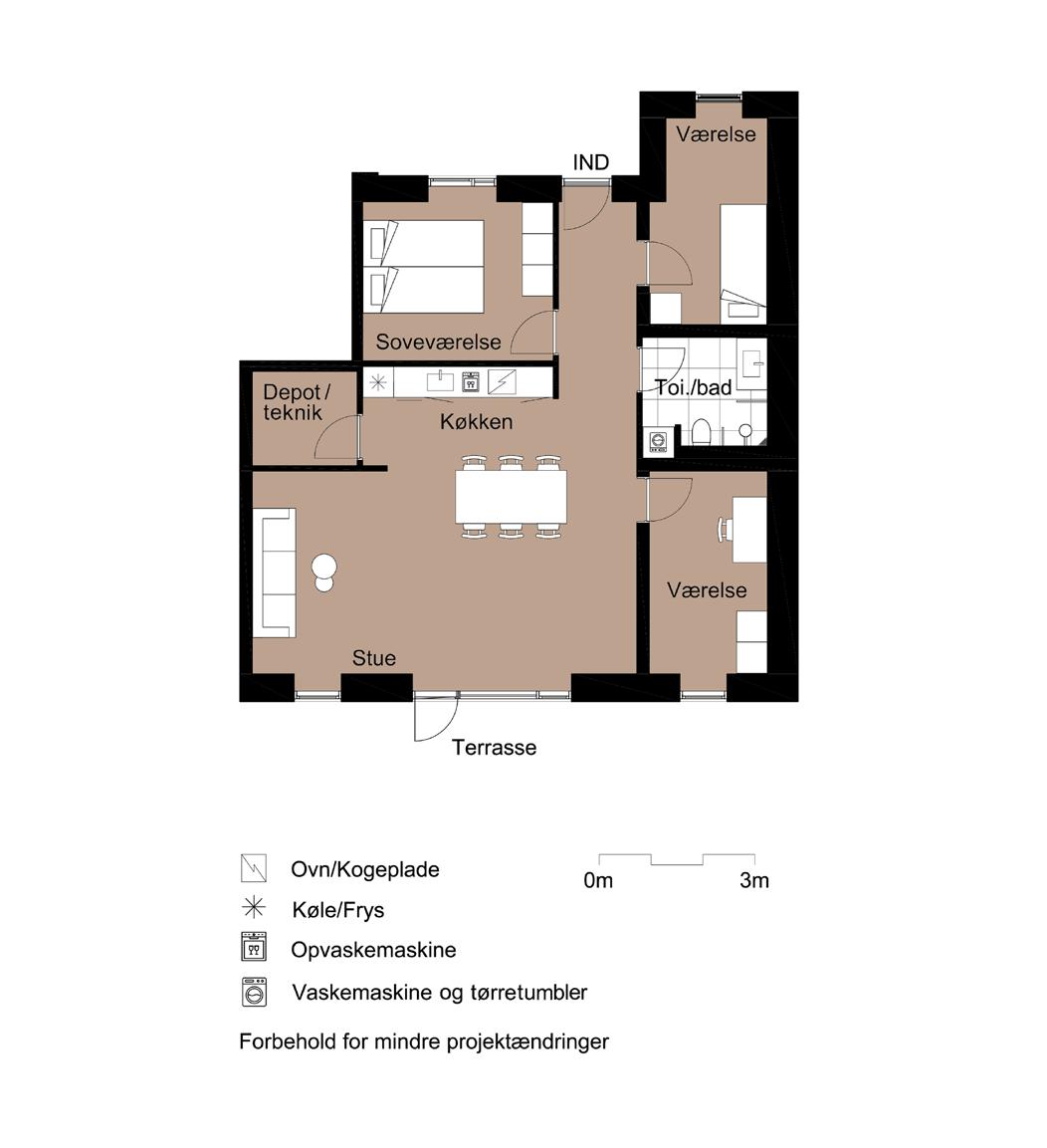 Derudover giver de store værelser gode muligheder for indretning af rum, man kan bruge til flere formål – der vil med den gode plads eksempelvis være god plads til kombinerede sove- og legeværelser til børnene. Til boligerne medfølger selvfølgelig også komplet hvidevarepakke.