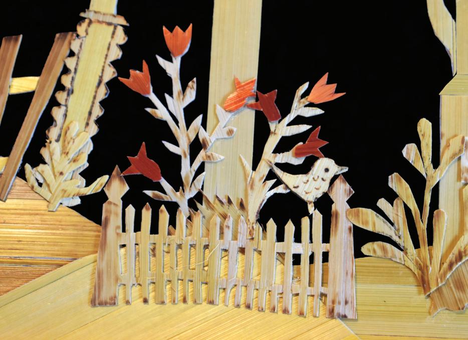 Aldona invited the Connecticut Museum into her workshop to show us her latest work, an intricate, two-dimensional scene using golden sheets of rye, which she has harvested, dried, and carefully ironed into shining straw ribbons. Her pictures often depict the country’s traditional agrarian society, for which rye was of utmost importance. Although a humble plant material, the straw gleams as it catches the light. In her siaudu menas, she includes religious and cultural icons and traditional patterns commonly found in ornamental carvings and textiles. With a woodburning tool, she etches even smaller details on the straw itself.