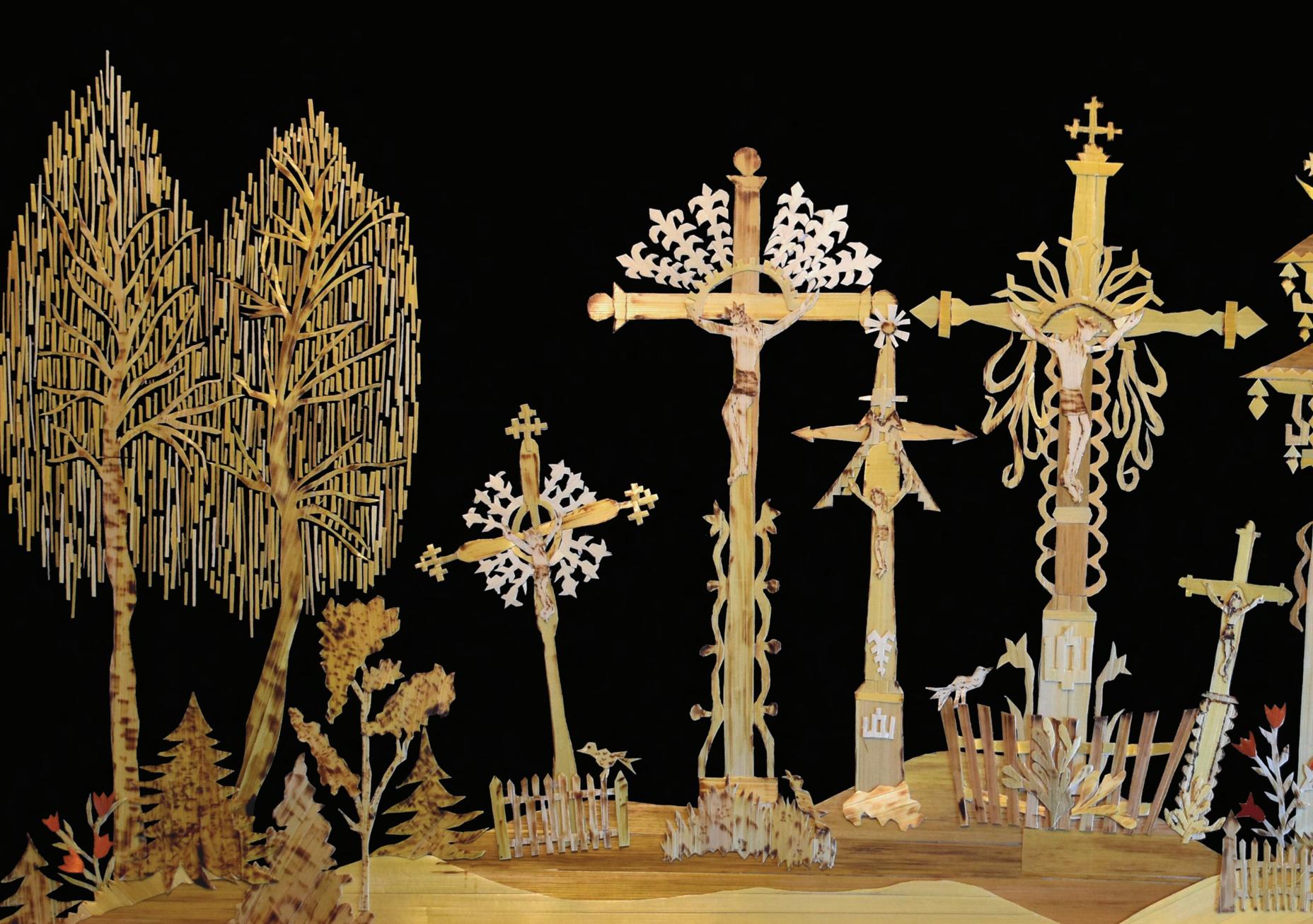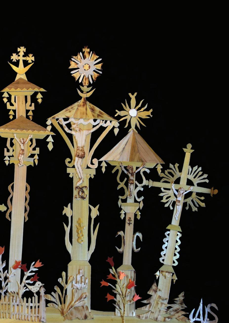 resistance, and remembrance is part of Lithuania’s Hill of Crosses, too. During the occupation, she explains, “when the Russians overnight destroyed the crosses, people went the following day, and already had built crosses, in memory of their son that had died, or their daughter, or the ones that were taken to Siberia.” Some of Aldona’s most personally meaningful versions of this scene have been for family, including family she has lost, and she remembers each piece’s distinguishing features.