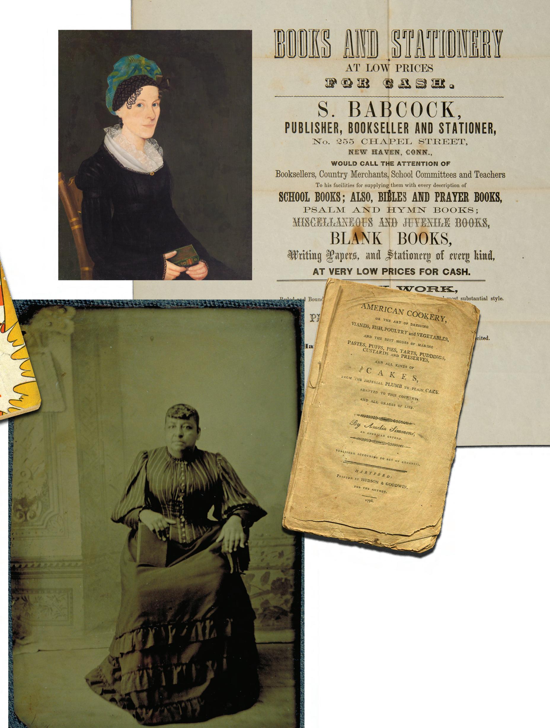 Broadside, “Books and Stationery at Low Prices for Cash,” published by Sidney Babcock, May 1862. Connecticut Museum collection, gift of Anonymous, 2022.58.0. Portrait of Sophia Wells Abernathy, attributed to Dr. Samuel Broadbent, about 1820. Connecticut Museum collection, gift of Mrs. Robert C. Buell, 1962.57.2. American Cookery by Amelia Simmons, published by Hudson & Goodwin, Hartford, CT, 1796. Connecticut Museum collection, 1796 S592a.