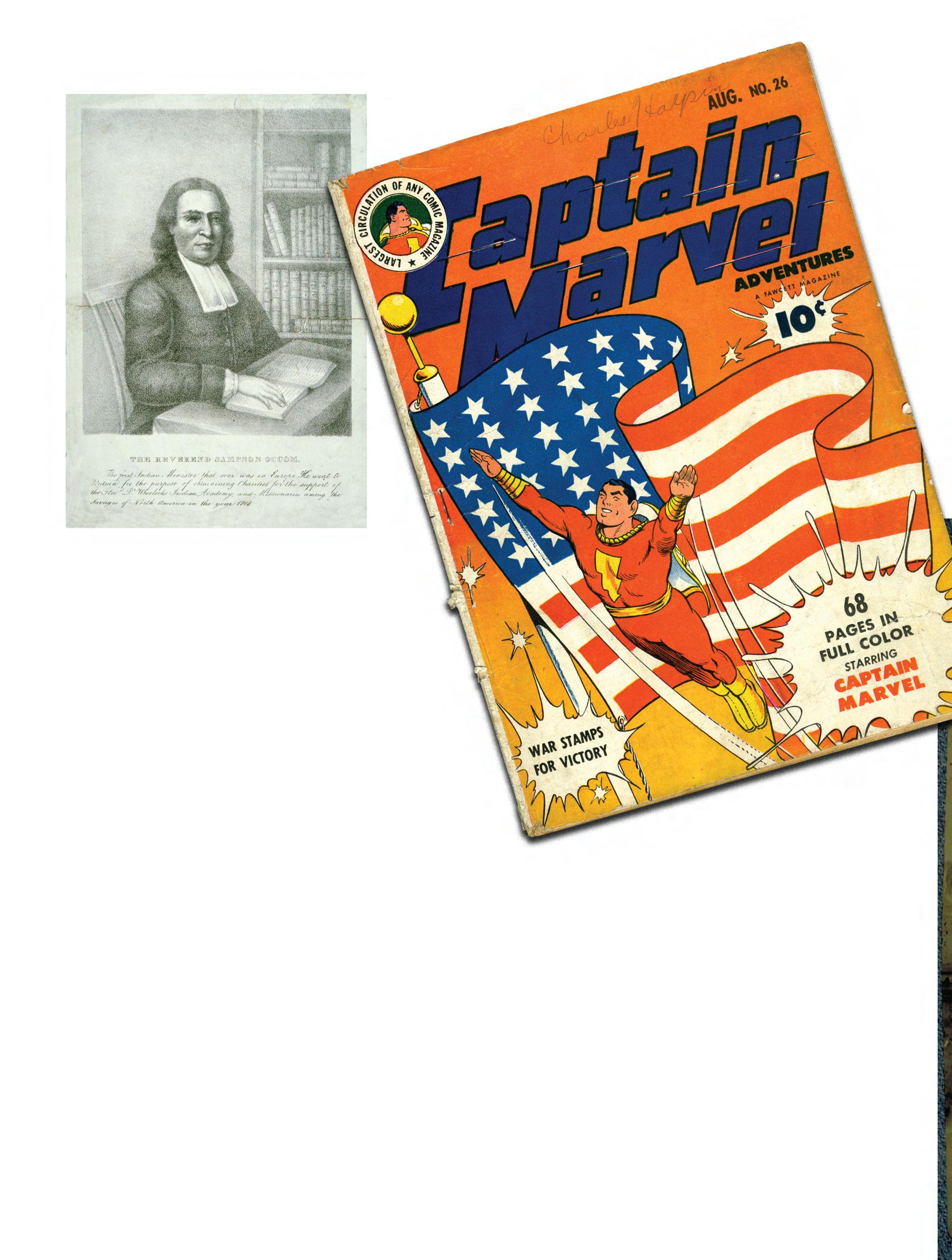 Reverend Sampson Occom, lithograph, about 1835. Connecticut Museum collection, gift of Mrs. Dea. Jabez Huntington, 1843.6.0. Captain Marvel Adventures, Vol 5, #26, published in August 1943 by Fawcett Publications, Inc., Greenwich, CT. Connecticut Museum collection, The Newman S. Hungerford Museum Fund. Studio portrait of a woman with a book, Norwich, CT, 1870–1890. Connecticut Museum collection, 1981.136.8.