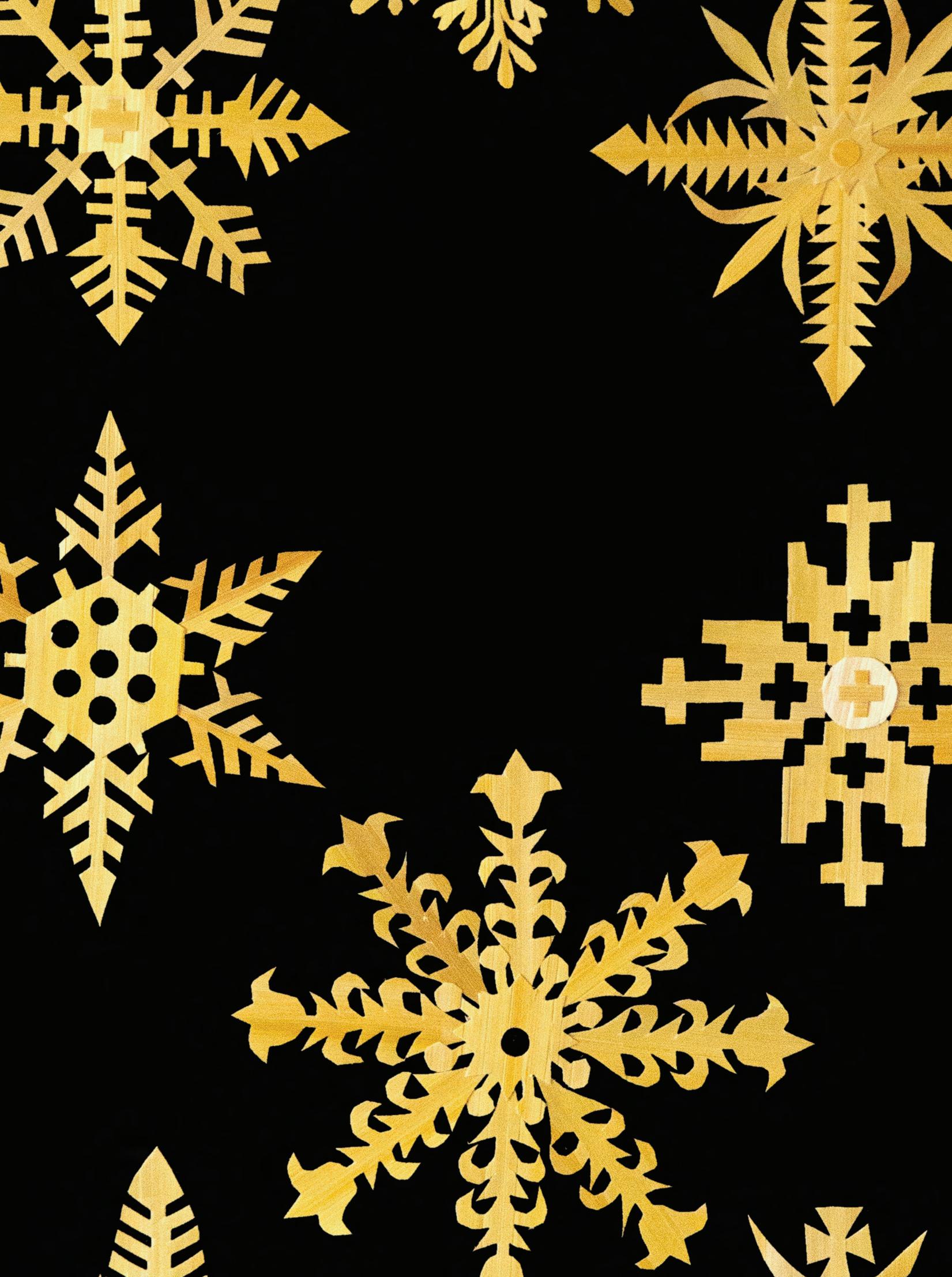 Another form of straw art Aldona makes are ornaments (siaudiniukai), in both two- and three-dimensional forms. In one, the ironed straw is cut and layered into stylized shapes like stars and crosses. In her three-dimensional ornaments, she cuts whole rye straws carefully into varying lengths, then draws thread through the hollow tubes to create geometric shapes. This technique is also used when she creates more elaborate mobiles of straw called sodai, or gardens. In her dining room, a Christmas tree stays up year-round, covered in straw ornaments in the shapes of stars, snowflakes, and hanging gardens.