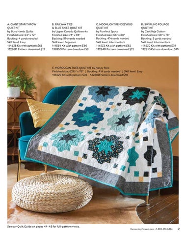 E. MOROCCAN TILES QUILT KIT by Nancy Rink Finished size: 621/2" x 76" | Backing: 43/4 yards needed | Skill level: Easy 114529 Kit with pattern $78 13280D Pattern download $10