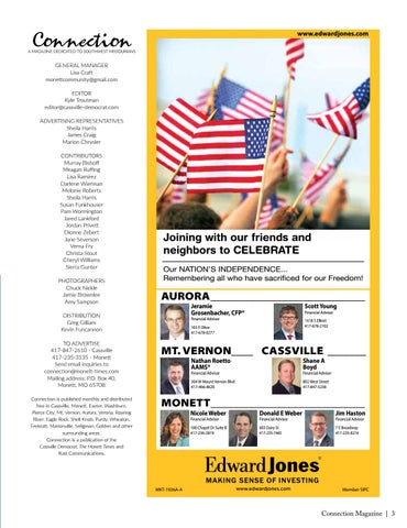 DISTRIBUTION Greg Gilliam Kevin Funcannon TO ADVERTISE 417-847-2610 - Cassville 417-235-3135 - Monett Send email inquiries to connection@monett-times.com Mailing address: P.O. Box 40, Monett, MO 65708