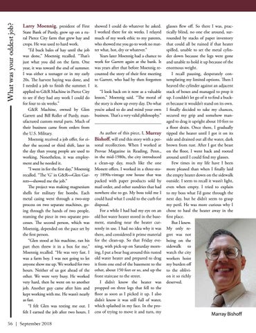 glasses flew off. So there I was, practically blind, no one else around, surrounded by stacks of paper inventory that could all be ruined if that heater spilled, unable to set the metal cylinder down because the legs were gone and unable to hold it up because of the enormous weight. I recall pausing, desperately contemplating my limited options. Then I heaved the cylinder against an adjacent stack of boxes and managed to prop it up. I couldn’t let go of it to find a bucket because it wouldn’t stand on its own. I finally decided to take my chances, secured my grip and somehow managed to drag it upright about 10 feet to a floor drain. Once there, I gradually tipped the heater until I got it on its side and drained out all the water, dark brown from rust. After I got the beast on the floor, I went back and rooted around until I could find my glasses. Few times in my life have I been more pleased than when I finally laid the empty heater down on the sidewalk outside. I seem to recall it wasn’t light, even when empty. I tried to explain to my boss what I’d gone through the next day, but he didn’t seem to grasp my peril. He was more curious why I chose to haul the heater away in the first place. But I knew. My only regret was not being on the sidewalk to watch the city workers hoist my burden off to the oblivion it so richly deserved.