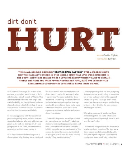 the small, obscure sign read “BEWARE BABY RATTLES” over a wooden crate that was casually covered in wire mesh. I knew that laws were different in the South and there seemed to be a lot more leeway when it came to certain things like guns and what people considered food, but I was certain that rattlesnakes could not be considered retail items or pets. I had just walked through the barbed wired entrance to a produce stand located in Rockdale County, a suburb outside of Atlanta. This area felt like the old South, with single lane roads flanked by red clay, fields and barbecue shacks. I noticed a Confederate flag. It was as if the Yankees had never invaded and restructured the South’s customs and beliefs. I’d been disappointed with the lack of local produce in grocery stores, so I was on a mission to find a farmer who only sold what was grown in the stiff, red Georgia dirt. If I was going to live in the South, I wanted the full experience, and that meant tasting it. I had found this stand after a long drive. I almost passed it by thinking it was a junkyard