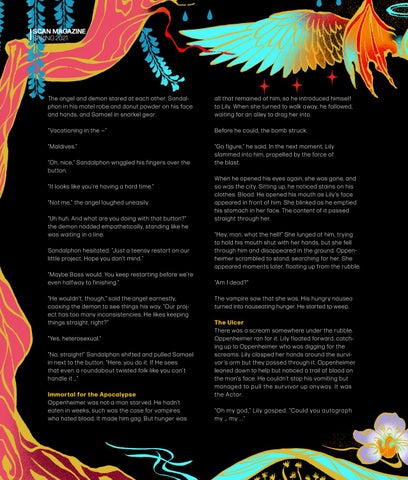 When he opened his eyes again, she was gone, and so was the city. Sitting up, he noticed stains on his clothes. Blood. He opened his mouth as Lily’s face appeared in front of him. She blinked as he emptied his stomach in her face. The content of it passed straight through her. “Hey, man, what the hell!” She lunged at him, trying to hold his mouth shut with her hands, but she fell through him and disappeared in the ground. Oppenheimer scrambled to stand, searching for her. She appeared moments later, floating up from the rubble. “Am I dead?” The vampire saw that she was. His hungry nausea turned into nauseating hunger. He started to weep. The Ulcer There was a scream somewhere under the rubble. Oppenheimer ran for it. Lily floated forward, catching up to Oppenheimer who was digging for the screams. Lily clasped her hands around the survivor’s arm but they passed through it. Oppenheimer leaned down to help but noticed a trail of blood on the man’s face. He couldn’t stop his vomiting but manag ed to pull t he s ur v ivor up any way. It was t he Actor. “O h my g od,” L ily g as ped, “C ould you autog raph my … my ..."
