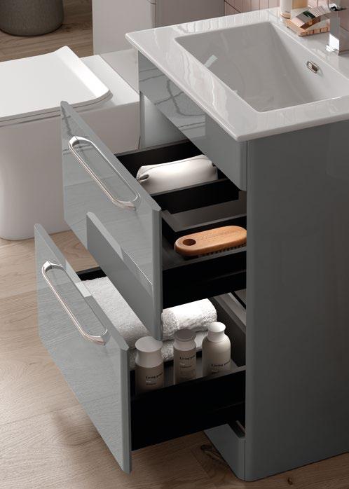 Sophisticated, effortlessly stylish and equally practical, Antoinette boasts a curved design with soft rounded edges and a high gloss finish. Motion-activated, integrated lighting is fitted to all units and is activated when the soft close drawers or doors are opened, offering useful illumination.