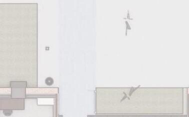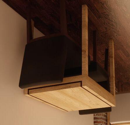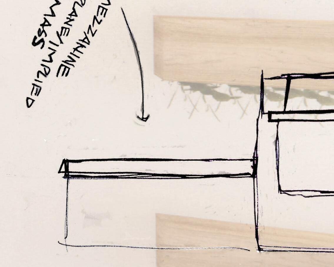 The built forms create a push and pull which the opposite wall responds to with slight wall additions. These panels extend up the double height space to become ceiling forms of various heights. Following the line of the mezzanine, these ceiling forms create an interlocking, zippered effect to create defined yet interlocking spaces.
