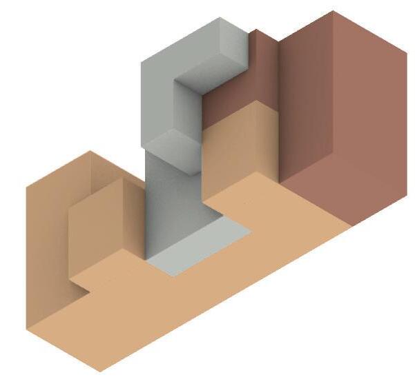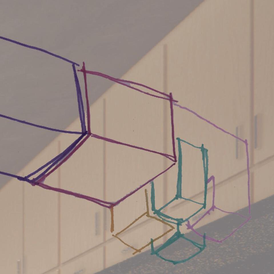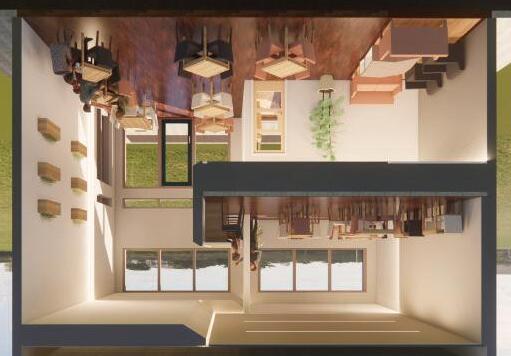 My self-chosen clients were a retired couple wishing to create a homey environment and a sense of community, so the design took a residential aesthetic. The space is made up of subtractive, interlocking forms to create a sense of connection. The connection between the forms is emphasized with light-filled reveals. Also featured in the design are angled forms inspired by the typical homey form of a pitched roof, and used to bridge between spaces.
