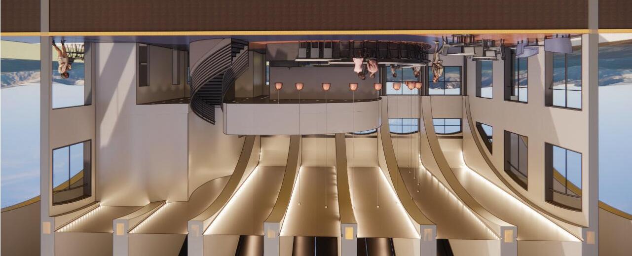 Curves in the vertical dimension also shape the space. Repeating ceiling arches cover the existing trusses and soften the overhead forms. These visually heavy forms then slim back to the original structure to create a weightless appearance.