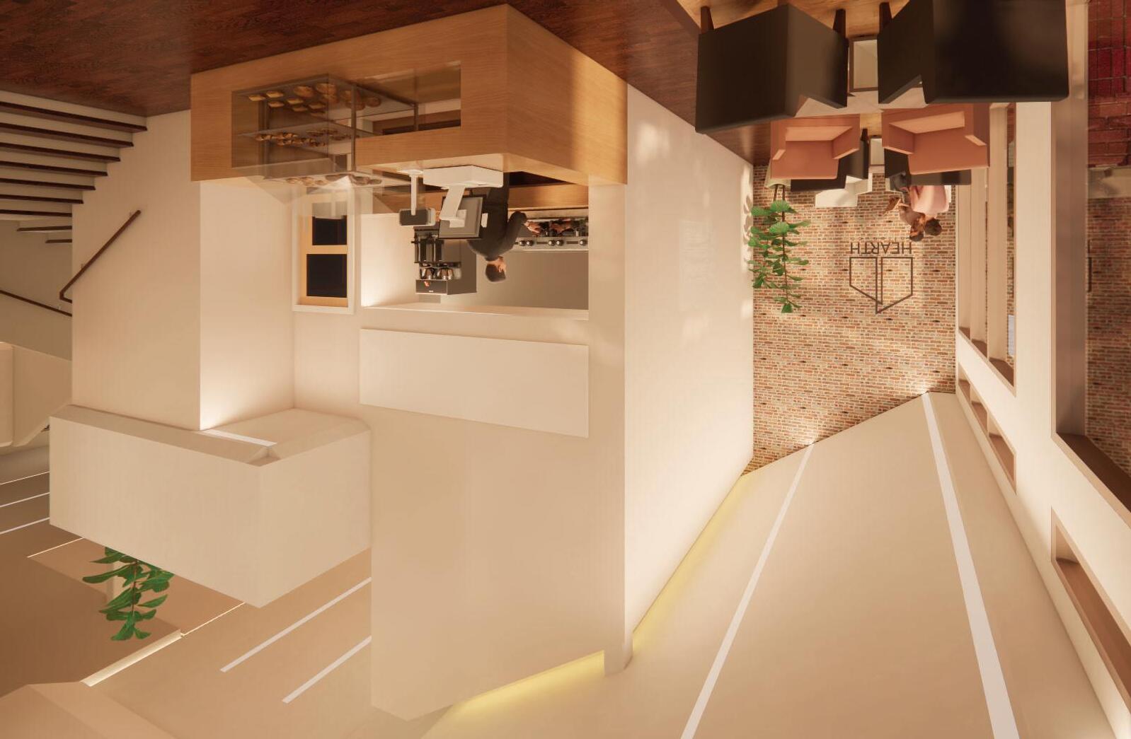 The large ceiling mass over the kitchen provides hierarchy to the ordering counter, and connects the front lounge space to the seating up in the mezzanine with it’s angled form. Similarly, the angles of the ceiling forms and edge of the mezzanine connect the seating between the two floors.