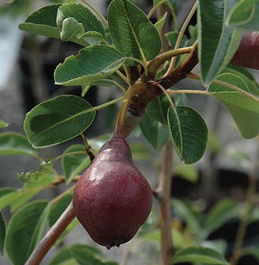 Bronze-red blushed apples, juicy, sweet and crisp. Early bearing and very productive.