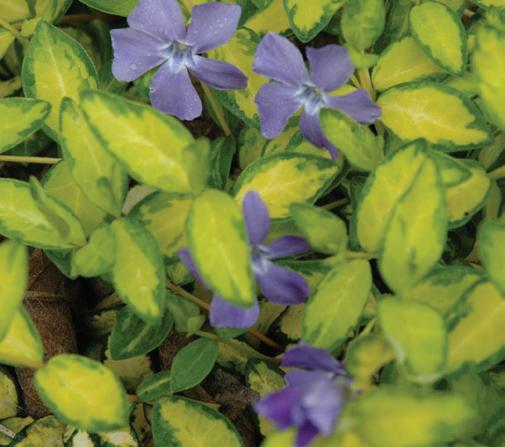A popular ground cover, forming a thick mat of glossy evergreen leaves, studded with periwinkle blue flowers. Quick to establish. Site carefully, provide containment.