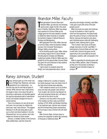 hird generation Connors State alum Brandon Miller, ag instructor and shooting sports coach, began his life in the small town of Hitchita, Oklahoma. Miller has always had a passion for Connors State as the college gave him the tools needed to transfer to Oklahoma State University to complete his bachelor’s degree in Natural Resource Ecology and Management. After graduation from OSU, Miller returned to Connors State, where he teaches multiple courses, from Computer Technology to Shotgun Safety, among others. As the shooting sports coach, Miller utilizes the shooting range at the Dr. Stuart Woods Shooting Sports Complex and Wetlands, located just outside of Warner. Miller says he’s grateful for all the opportunities Connors State has given him and continues to help students see their true potential. “I get to teach my students about the things I am most passionate about, natural