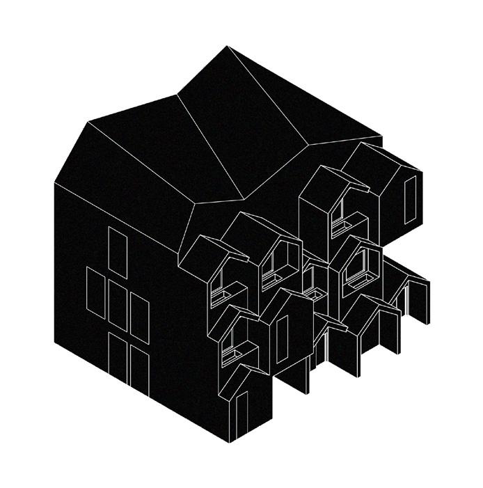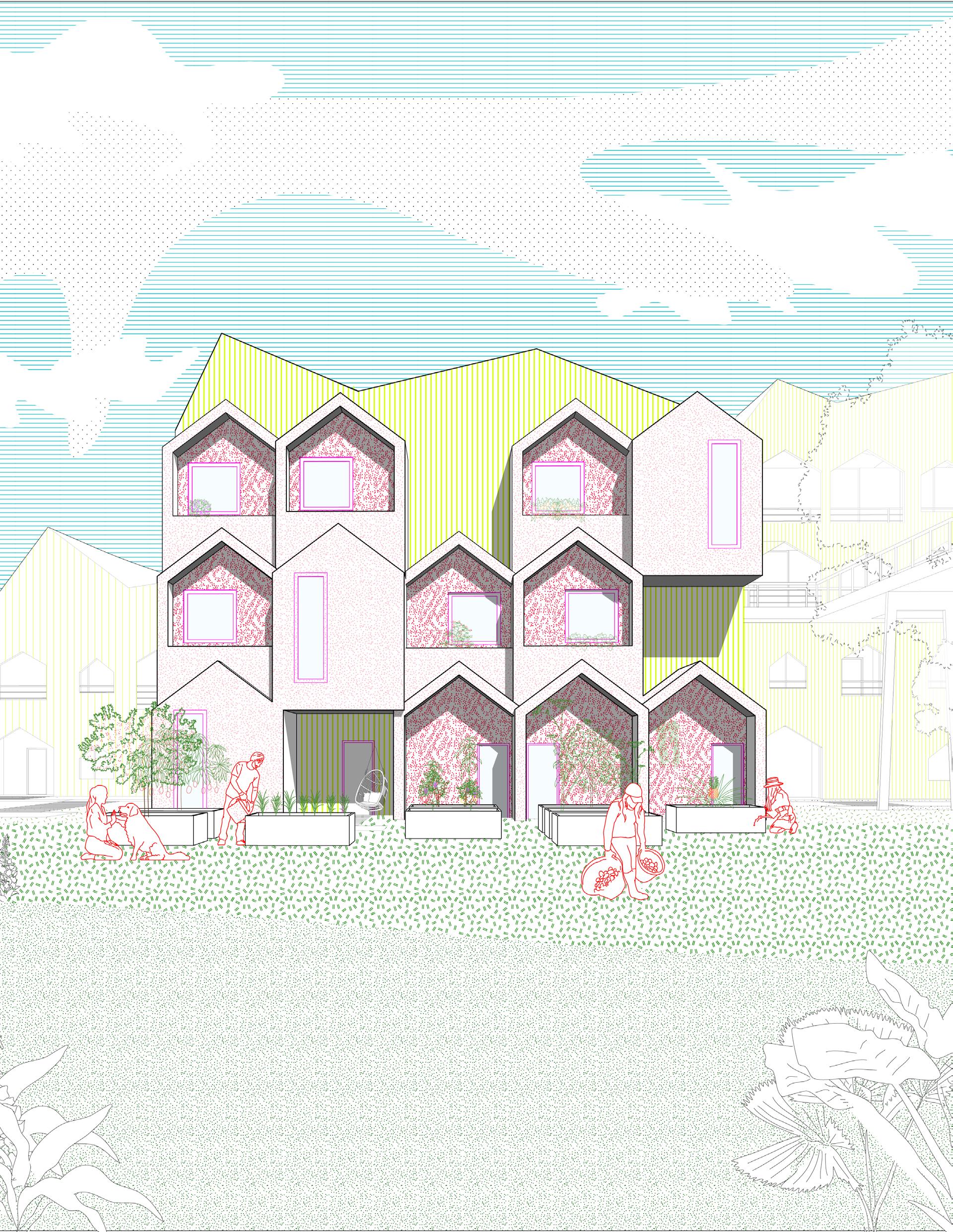 To keep a feeling of individualism within a co-living environment, each room offers a blank space for residents to display their personality. This is further emphasized formally with gabled roofs on the exterior highlighting each room.