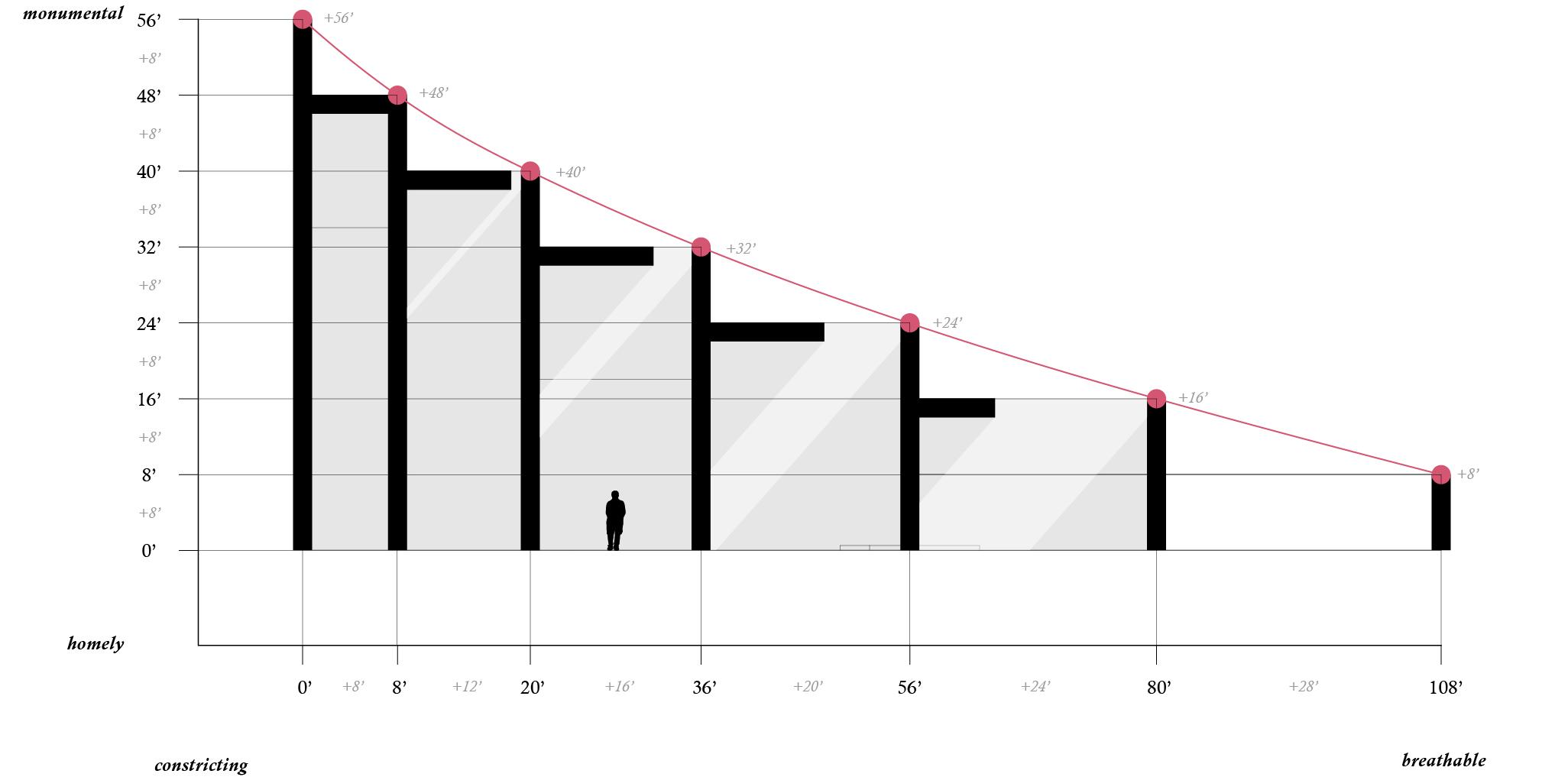 Similar to these “versus” words, each space in the proposal can be easily characterized as positive or negative, however, the pavilion is a gradient, with each room inching closer to its opposite. The walls get cleaner and more spread out, the ceiling retracts and invites more light, and the landscape is brought back to life. The emotions you feel as you pass through are subjective and influenced by your personal biases. As you walk through examine the formal values, material conditions, landscaping, circulation, and lighting conditions, and see how they elevate or degrade the space.