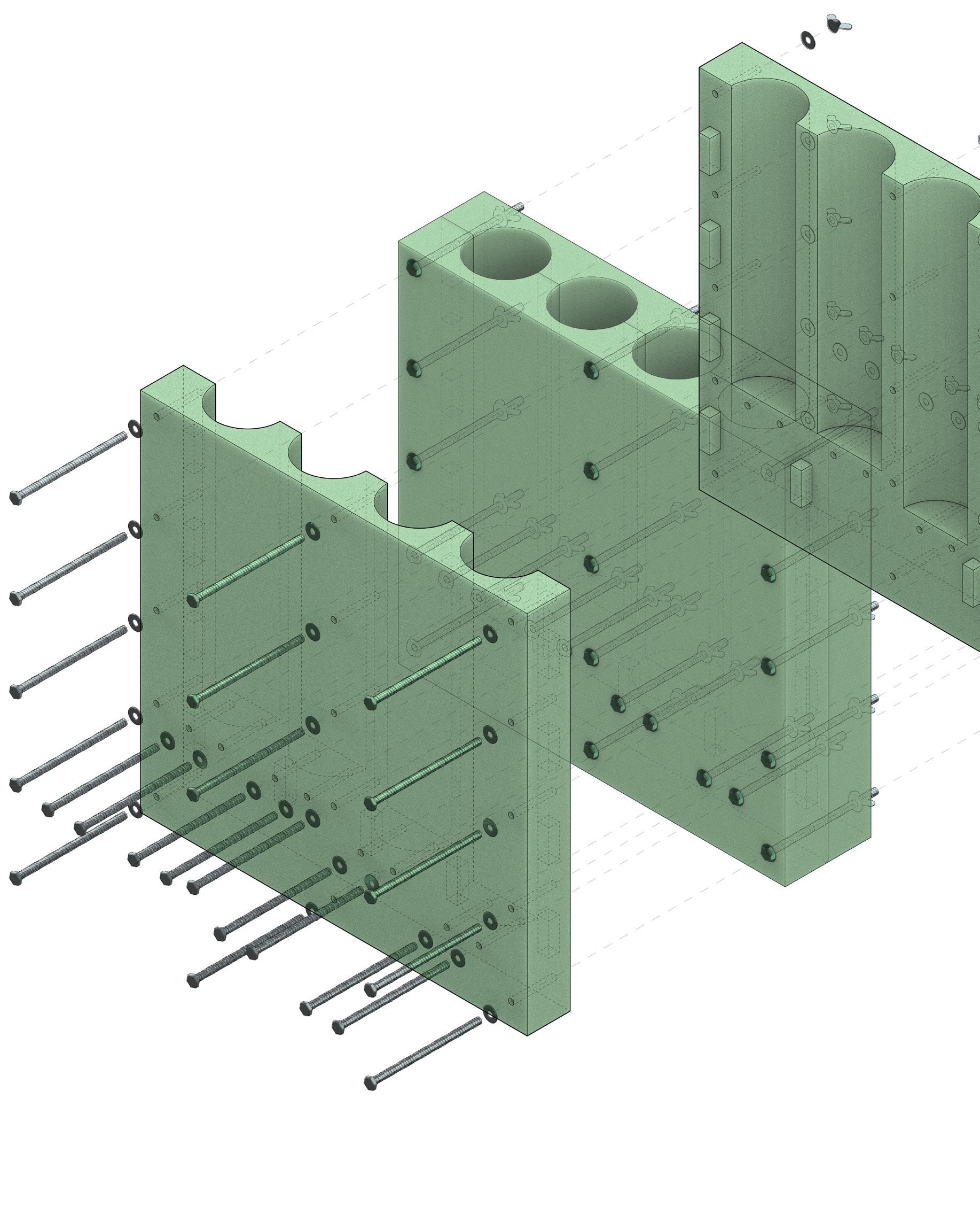 A mold was created to produce the individual “bricks” that make up the block. The four channels have various depths for different-sized “bricks.”