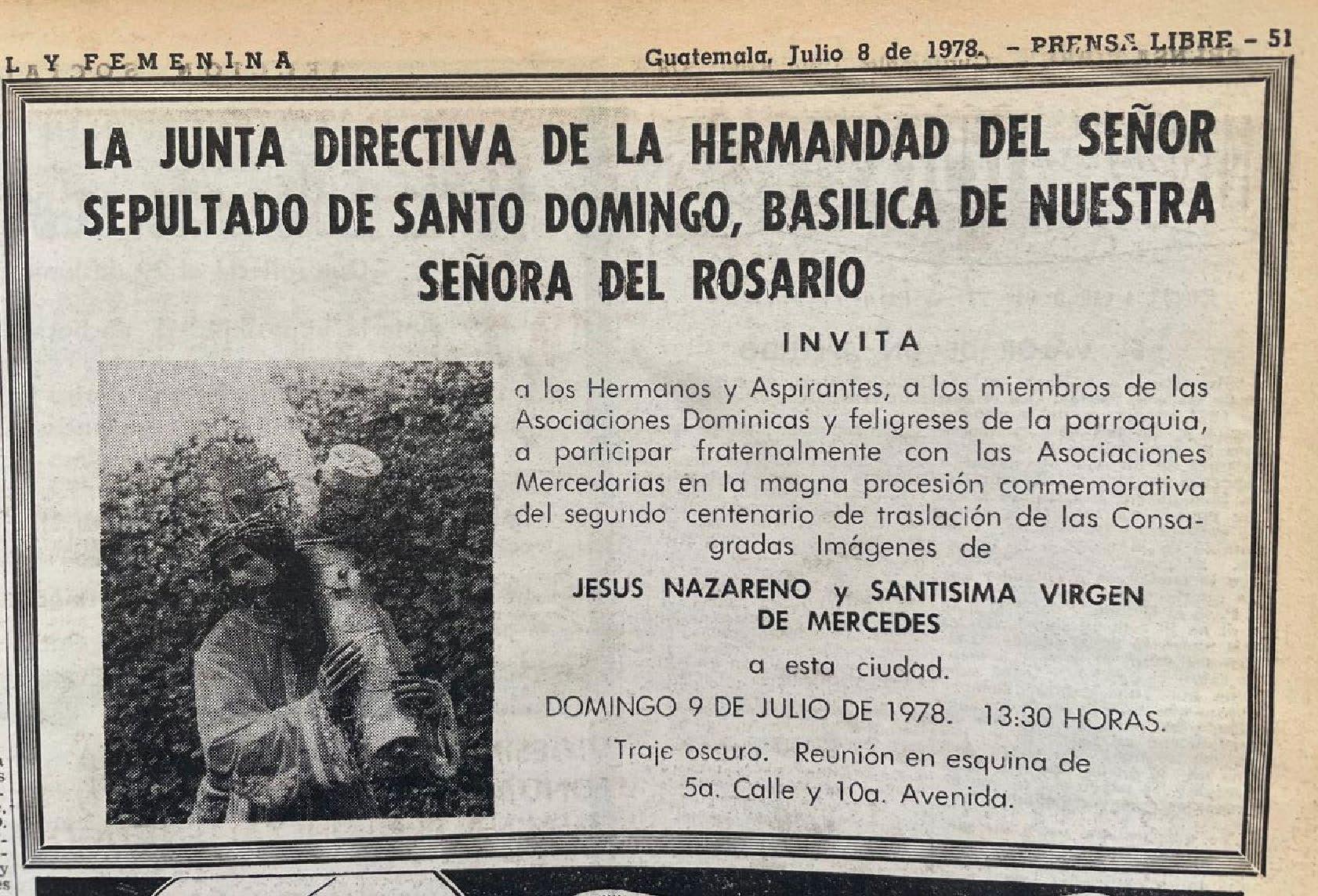 Prensa libre: Ese mismo día salió este anuncio invitando a participar en las actividades mercedarias extendida por la Junta Directiva del Señor Sepultado de Santo Domingo, Cristo del Amor.