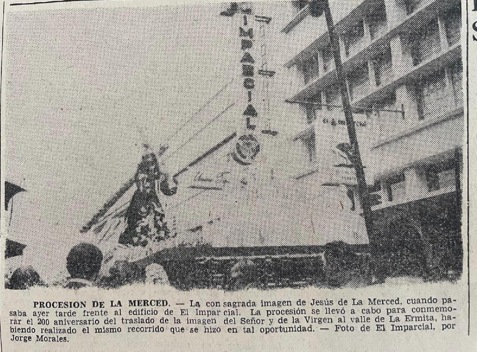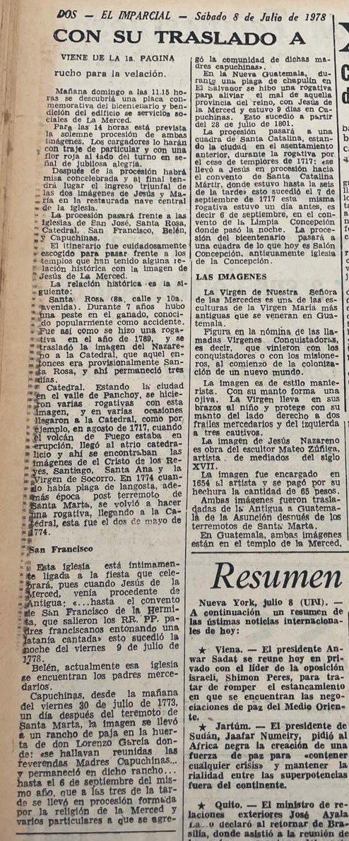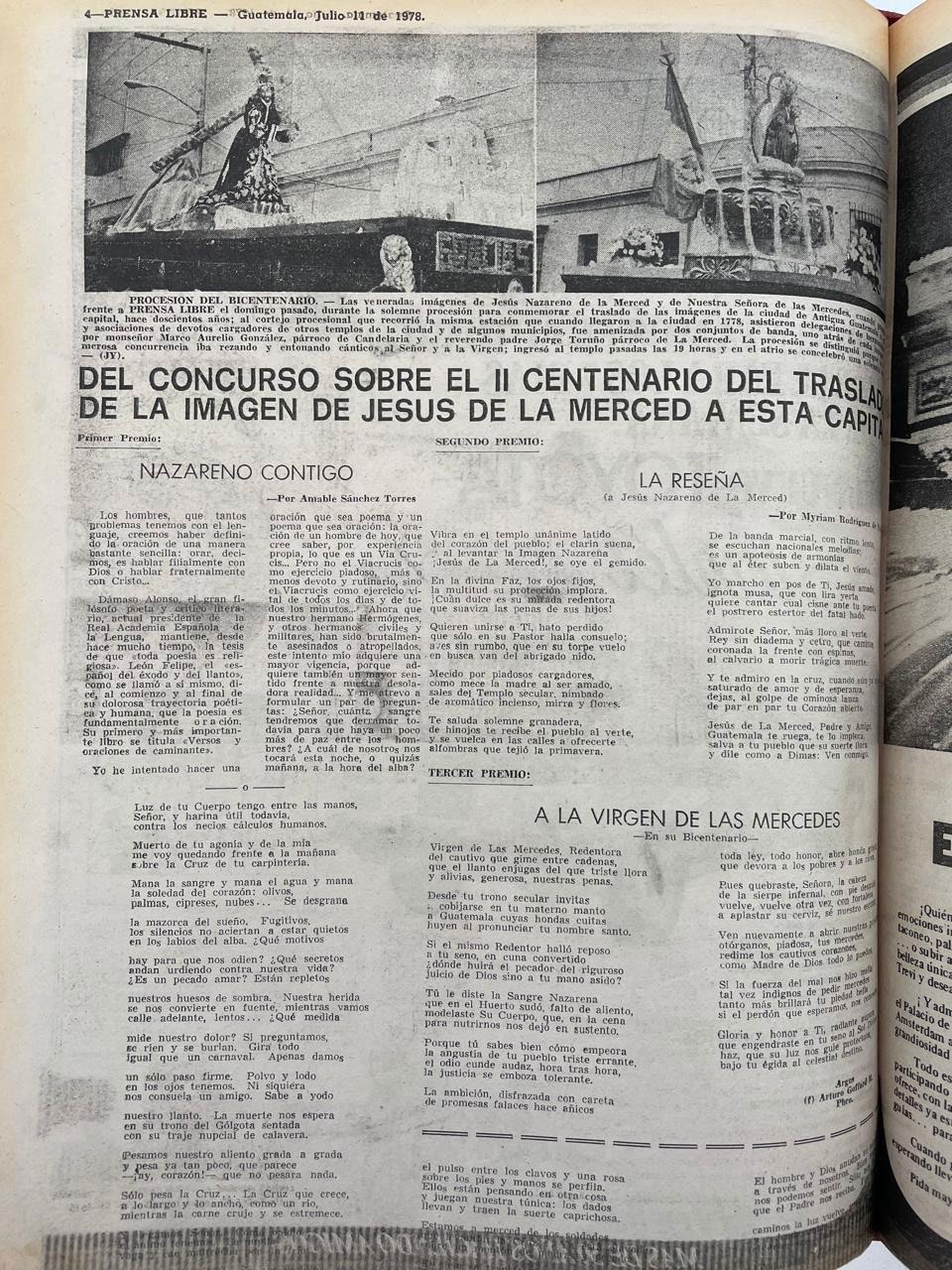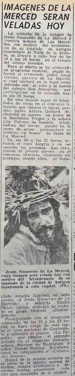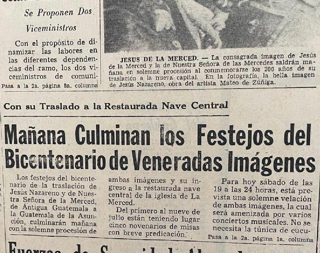 "1778-1978 fueron fechas que, al promediar el año de 1977, con insistencia empezaron a mencionarse. Había una razón: grandes solemnidades se preparaban en el Templo Mercedario de la Nueva Guatemala y no era para menos, muy pronto (El 9 de julio de 1978) se cumplirían DOS SIGLOS de que la Consagrada Imagen de Jesús Nazareno y su Santísima Madre, Nuestra Señora de las Mercedes, Patrona del Templo Parroquial de la Merced, reciben la veneración de sus devotos, en este Valle de la Ermita o de la Virgen a donde arriban después de dramático peregrinaje […]"¨*