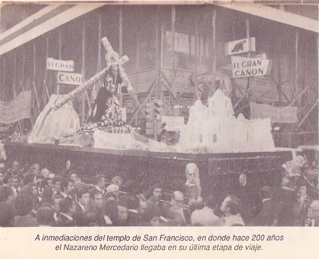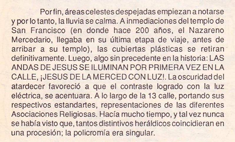 Algo nunca antes visto o por lo menos así lo describen las crónicas, fue contemplar el instante histórico a eso de las dieciocho horas con treinta minutos, y en plena trece calle cuando la procesión pasó repito entre San Francisco y Santa Clara, se iluminaron las andas del Nazareno que para algunos es el más bellamente esculpido. Recordemos que los recorridos de aquel entonces, Martes Santo de 10.00 a 12.00 horas y Viernes Santo de 6.00 a 15.00 respectivamente, implicaban que Jesús de la Merced salía a su templo y retornaba con el marco de la luz natural. Pero en aquel instante, constituyó todo un espectáculo contemplar las andas iluminadas artificialmente, situación que causó una gran expectación y un recuerdo imperecedero.