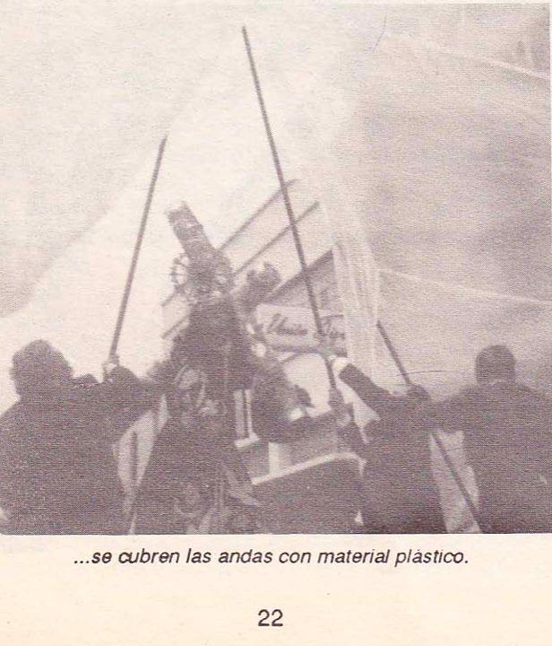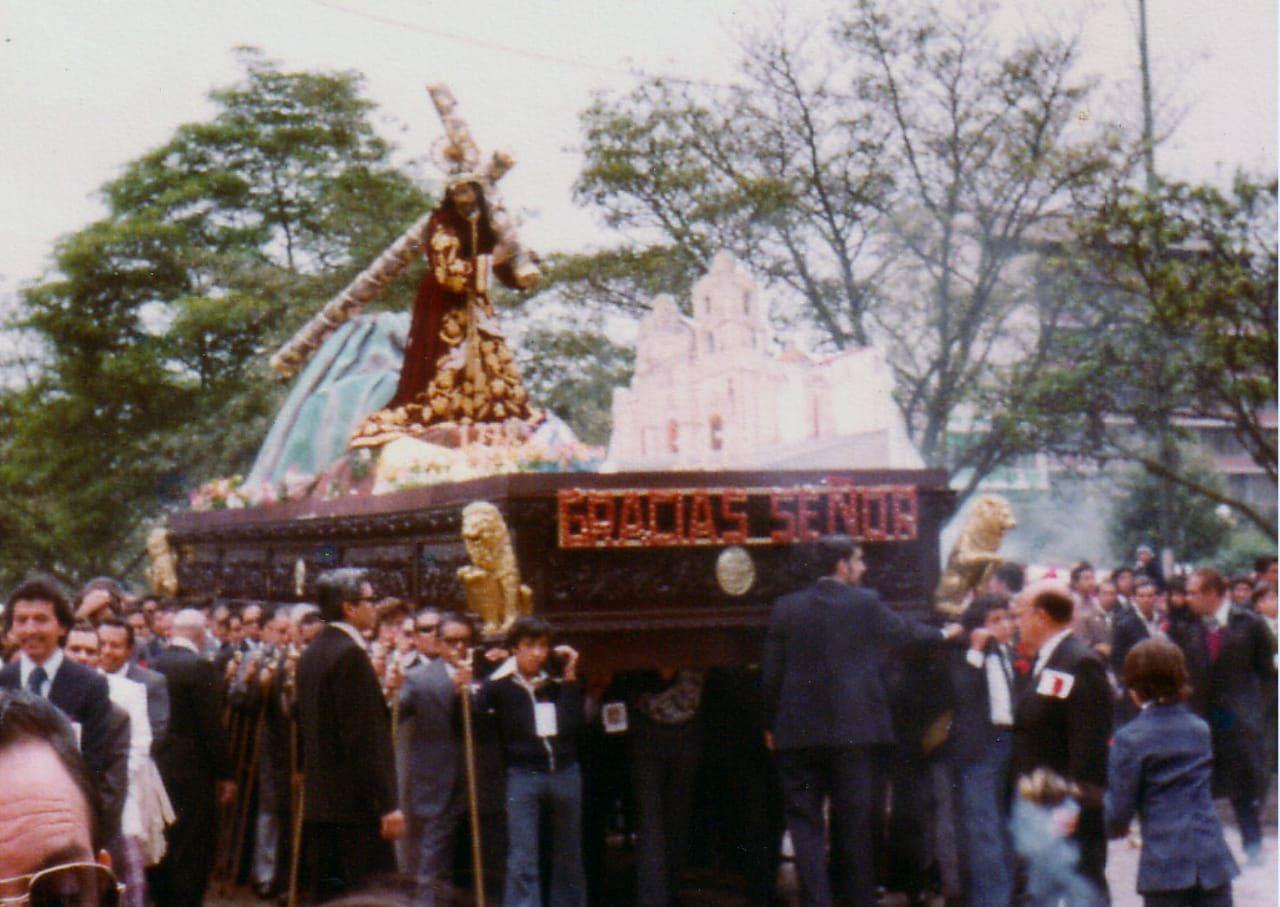 Luego la lluvia arreció y luego escampó un poco. En ese momento nos ordenaron salir a formarnos a la 8ª calle. A mí me tocó fila izquierda. Estando en la fila del turno, empezó a pasar atrás de mí la fila de cucuruchos, pero esta vez, de particular, algunos de traje, otros no, y alcancé a oír comentarios sobre el peso del anda. Unos decían que era por el agua y otros que no, que era porque abajo llevaba los acumuladores para la iluminación en horas de la noche. Jesús venía más o menos como a una cuadra cuando de nuevo empezó a llover. Alcancé a ver como lo cubrieron con plástico y así, protegido del agua, reinició su recorrido. Nosotros nos mantuvimos en nuestro puesto, aguardando el momento de tomar el brazo. Finalmente llegó. Sonó el timbre y comenzamos el ascenso de la 8ª calle. Fue la primera vez que cargué bajo la lluvia. Los años me irían regalando en el futuro otras oportunidades similares. Lo primero que pensé fue que lo que había oído era cierto…. ¡pesaba! El anda de Viernes Santo de aquellos tiempos pesaba y crujía, lo recordaba del año anterior cuando cargué a Jesús por primera vez. Pero este peso era mayor. Recuerdo a lo lejos que tocaron dos veces el timbre durante el ascenso. Finalmente llegamos a la 7ª avenida y entregamos el turno. Lastimosamente ya no me acuerdo la marcha que nos tocó en esa cuadra. Pero nunca olvidaré aquel lluvioso domingo de julio, hoy hace cuarenta y seis años…
