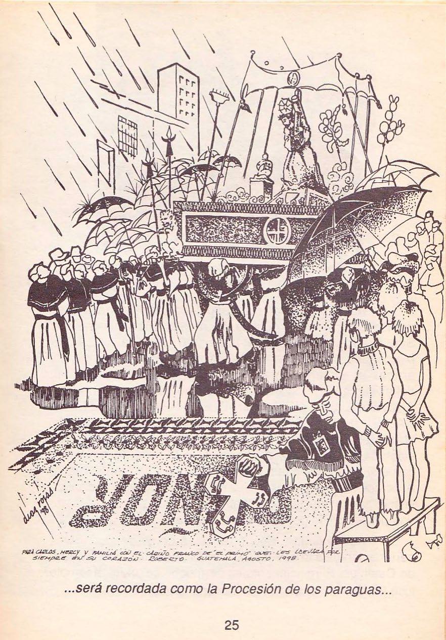 Julio es un mes emblemático de la temporada de lluvias en Guatemala, y aquel domingo 9 durante la tarde no fue la excepción. Recuerdo perfectamente que dos torrenciales aguaceros, quisieron atestiguar el paso de Jesús: el primero a la altura del Parque Infantil Colón a la ida (donde por aquel entonces funcionaba el Mercado Central debido al terremoto del 76) y el otro por toda la cuarta avenida, entre la octava y la trece calles. Una gentil dama cuyo rostro tengo en mente como si la estuviese viendo, pero su nombre lamentablemente se me escapa por el tiempo, nos facilitó un paraguas para cubrir al estandarte de la Cofradía del Santo Rosario.