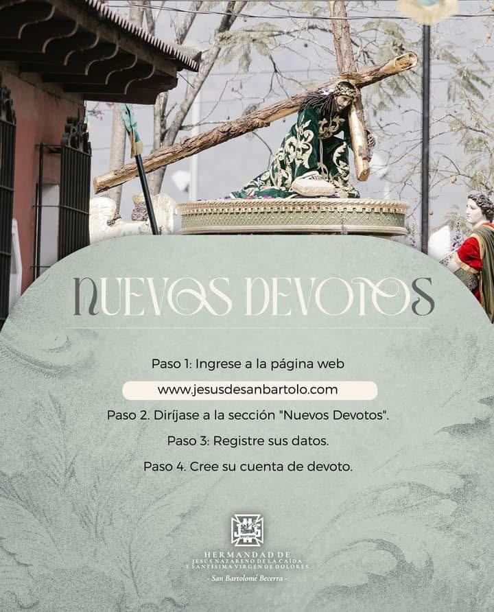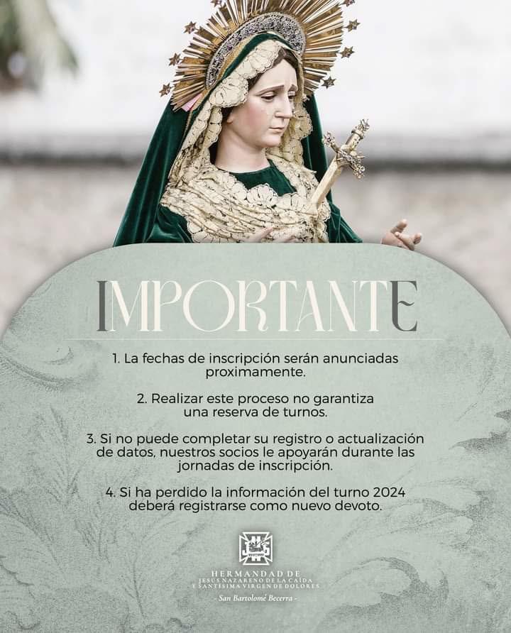 A continuación, le compartimos información importante que ha circulado en redes sociales relacionada con inscripciones para cortejos de Cuaresma y Semana Santa 2025, así como actividades especiales a acontecer en los próximos meses. Créditos a las hermandades y asociaciones que las han compartido en sus páginas oficiales. Para mayor información, estar pendiente de las comunicaciones oficiales de dichas hermandades.