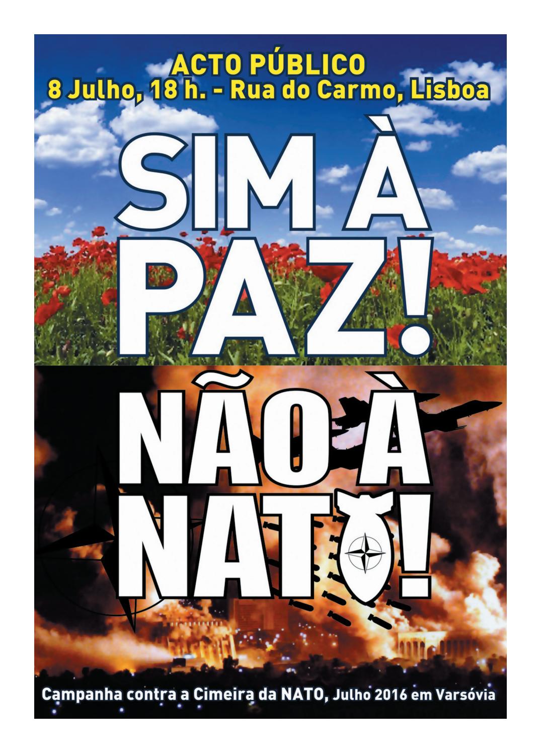 Sim à Paz! Não à NATO! - Não aos objectivos belicistas da cimeira de Varsóvia Tal como sucederá noutros países da Europa, também em Portugal organizações das mais variadas áreas de intervenção uniram-se para contestar os objectivos belicistas da cimeira que a NATO realiza na capital da Polónia, Varsóvia, nos próximos dias 8 e 9 de Julho, e afirmar a exigência da dissolução deste bloco políticomilitar, que tem sido a principal ameaça à paz e à segurança na Europa e no mundo. Num momento em que se multiplicam situações de tensão e conflito e aumenta a insegurança e a instabilidade internacionais, a realização desta cimeira e os seus objectivos belicistas, num momento em que a NATO se aproxima cada vez mais das fronteiras da Federação Russa e intervém no Mediterrâneo, são de uma imensa gravidade. Os tempos não são de indiferença, mas de esclarecimento e mobilização: pela paz; pela retirada de todas as forças da NATO envolvidas em agressões militares; pelo fim da chantagem, desestabilização e guerras de agressão contra estados soberanos; pelo apoio aos refugiados, vitimas das guerras que a NATO promove e apoia; pelo encerramento das bases militares em território estrangeiro e do desmantelamento do sistema anti-míssil dos EUA/NATO; pelo desarmamento geral e da abolição das armas nucleares e de destruição massiva; pela dissolução da NATO; e pelo cumprimento por parte das autoridades portuguesas dos princípios consagrados na Constituição da República Portuguesa e na Carta das Nações Unidas, no respeito pela soberania e igualdade de povos e Estados. Sim à Paz! Não à NATO!