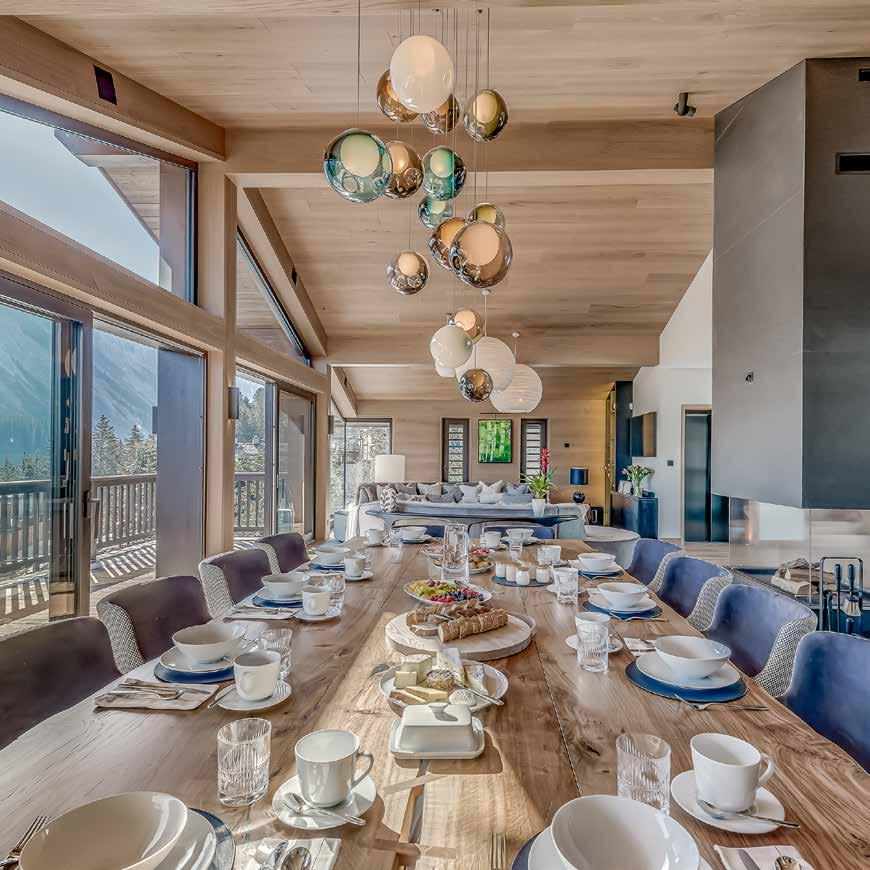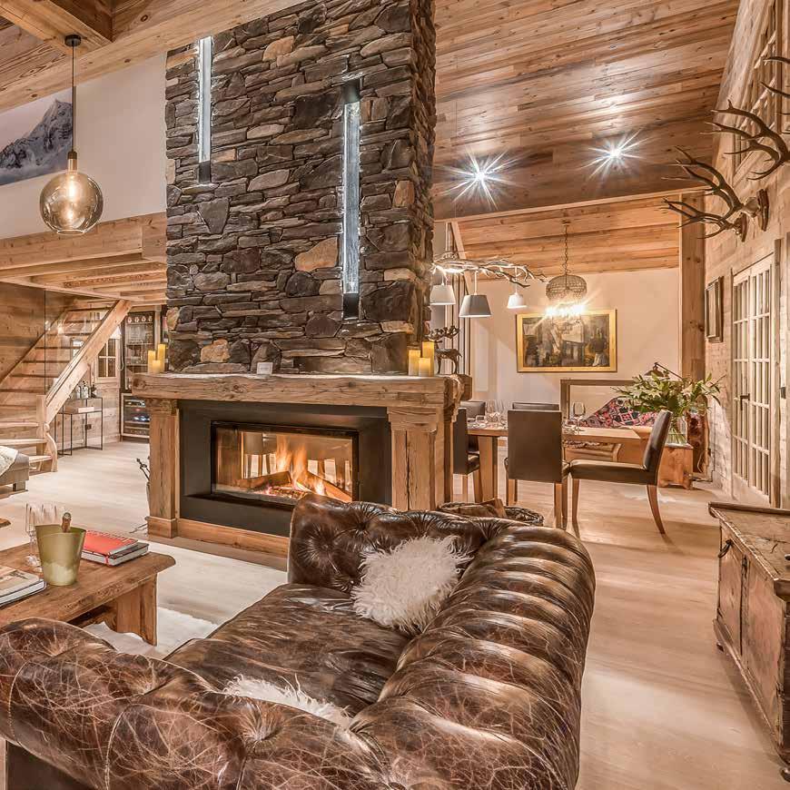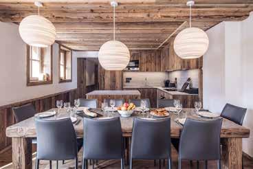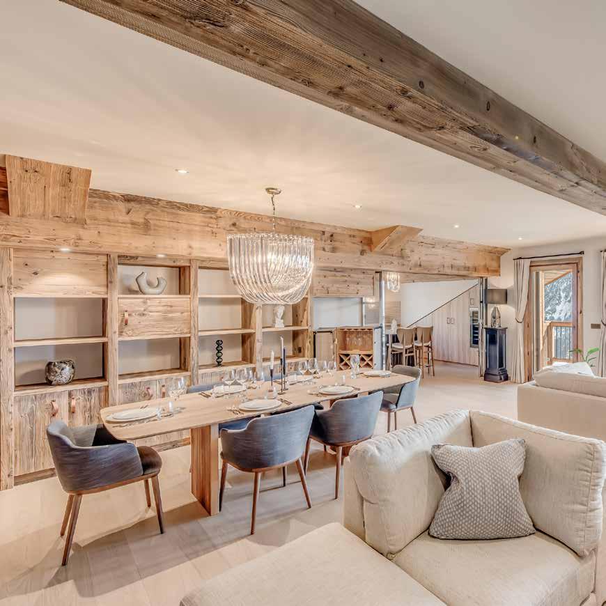 area centred around its welcoming fireplace. There’s an adjoining snug with a TV and office area, whilst the dining room connects directly to the open-plan kitchen with a breakfast seating area. Outside, there’s a garden and terrace offering mountain views and a private Jacuzzi from which to enjoy them. There are five en-suite bedrooms, a private heated ski and boot locker, and two underground parking spaces.