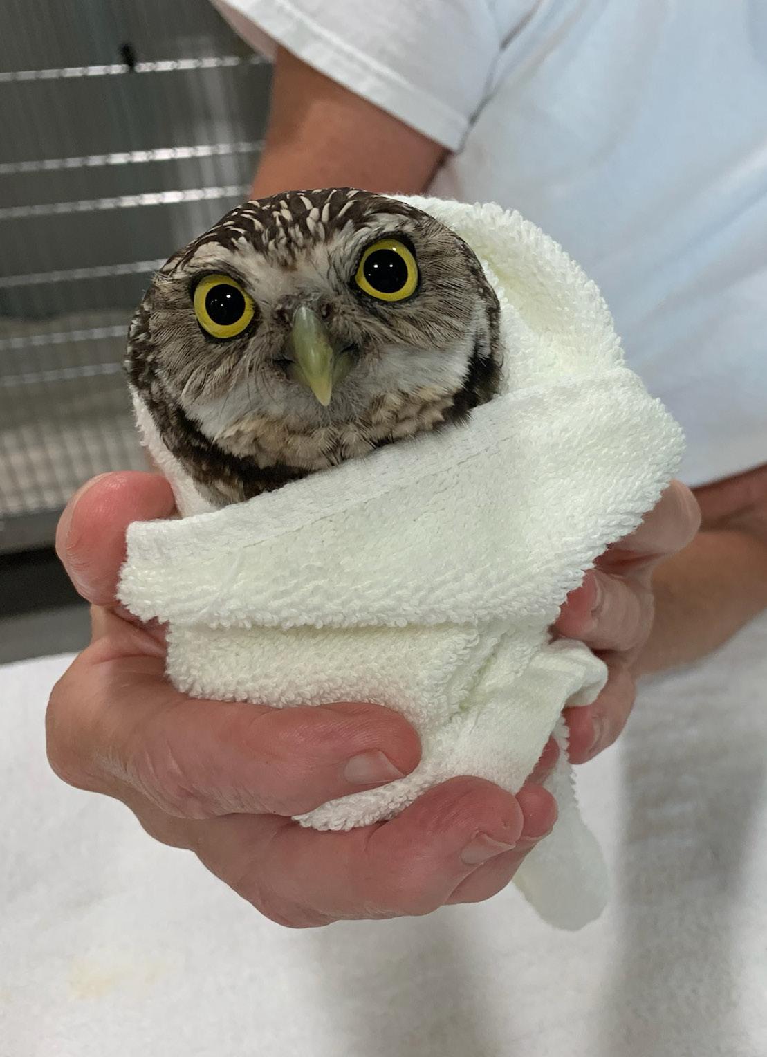 This fledgling great horned owl, treated at the von Arx Animal Hospital, will grow to develop a wingspan of up to five feet.