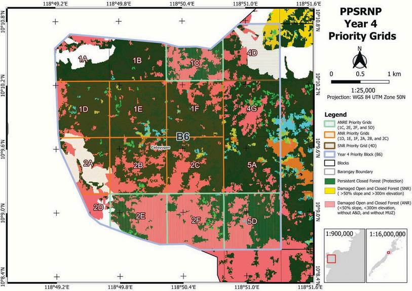 Year one prioritizes damaged areas (Blocks B1, B2) located in Cabayugan (Figure 5). Blocks 1 and 2 have large damaged areas (pink and yellow) adjacent to patches of persistent forest (green). These areas are also prone to human intrusion and anthropogenic activities since they are adjacent to the boundaries of Barangay Tagabinet. Thus, to prevent further degradation and fragmentation of these areas, blocks 1 and 2 are included in the priorities for restoration. Assisted Natural Regeneration (ANR) will be primarily implemented to restore damaged areas and reconnect them to other forest patches