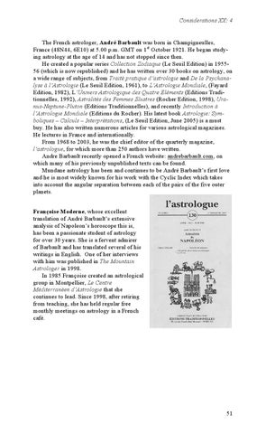 Considerations XX: 4 The French astrologer, André Barbault was born in Champigneulles, France (48N44, 6E10) at 5.00 p.m. GMT on 1st October 1921. He began studying astrology at the age of 14 and has not stopped since then. He created a popular series Collection Zodiaque (Le Seuil Edition) in 195556 (which is now republished) and he has written over 30 books on astrology, on a wide range of subjects, from Traité pratique d’astrologie and De la Psychanalyse à l’Astrologie (Le Seuil Edition, 1961), to L’Astrologie Mondiale, (Fayard Edition, 1982), L’Univers Astrologique des Quatre Eléments (Editions Traditionnelles, 1992), Astralités des Femmes Illustres (Rocher Edition, 1998), Uranus-Neptune-Pluton (Editions Traditionnelles), and recently Introduction à l’Astrologie Mondiale (Editions du Rocher). His latest book Astrologie: Symboliques – Calculs – Interprétations, (Le Seuil Edition, June 2005) is a must buy. He has also written numerous articles for various astrological magazines. He lectures in France and internationally. From 1968 to 2003, he was the chief editor of the quarterly magazine, l’astrologue, for which more than 250 authors have written. Andre Barbault recently opened a French website: andrebarbault.com, on which many of his previously unpublished texts can be found. Mundane astrology has been and continues to be André Barbault’s first love and he is most widely known for his work with the Cyclic Index which takes into account the angular separation between each of the pairs of the five outer planets. Françoise Moderne, whose excellent translation of André Barbault’s extensive analysis of Napoleon’s horoscope this is, has been a passionate student of astrology for over 30 years. She is a fervent admirer of Barbault and has translated several of his writings in English. One of her interviews with him was published in The Mountain Astrologer in 1998. In 1985 Françoise created an astrological group in Montpellier, Le Centre Méditerranéen d’Astrologie that she continues to lead. Since 1998, after retiring from teaching, she has held regular free monthly meetings on astrology in a French café.