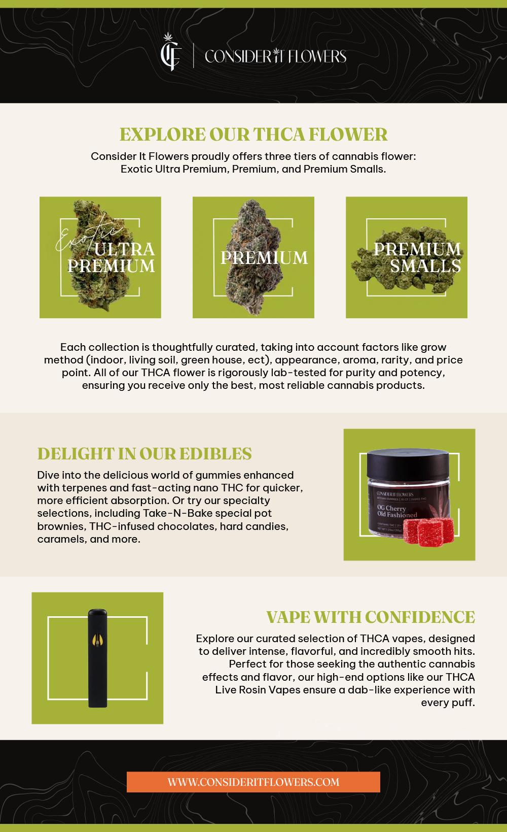https://www.consideritflowers.com/product-category/shop-categories/thca-flower/ - Consider It Flowers offers top-quality THCA cannabis products, including Exotic Ultra Premium, Premium, and Premium Smalls flowers, all lab-tested for purity and potency. Enjoy fast-acting nano-THC gummies, brownies, chocolates, and more in our delicious edibles range. Our THCA Live Rosin Vapes provide a smooth, flavorful, dab-like experience with every puff. Order now to elevate your cannabis experience! Contact us at (615) 420-7179 or email hello@consideritflowers.com. Visit Consider It Flowers for more information. Premium cannabis delivered to your door!
