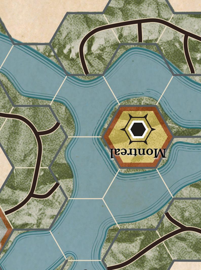 As a city settlement, Montreal has roads available from each of its six hexsides. Illustrated are some of the several possible 1-hex and 2-hex crossings to and from Montreal.