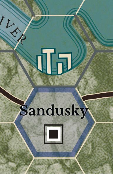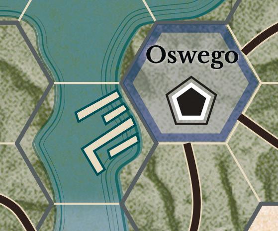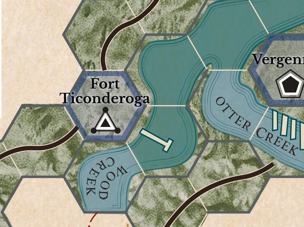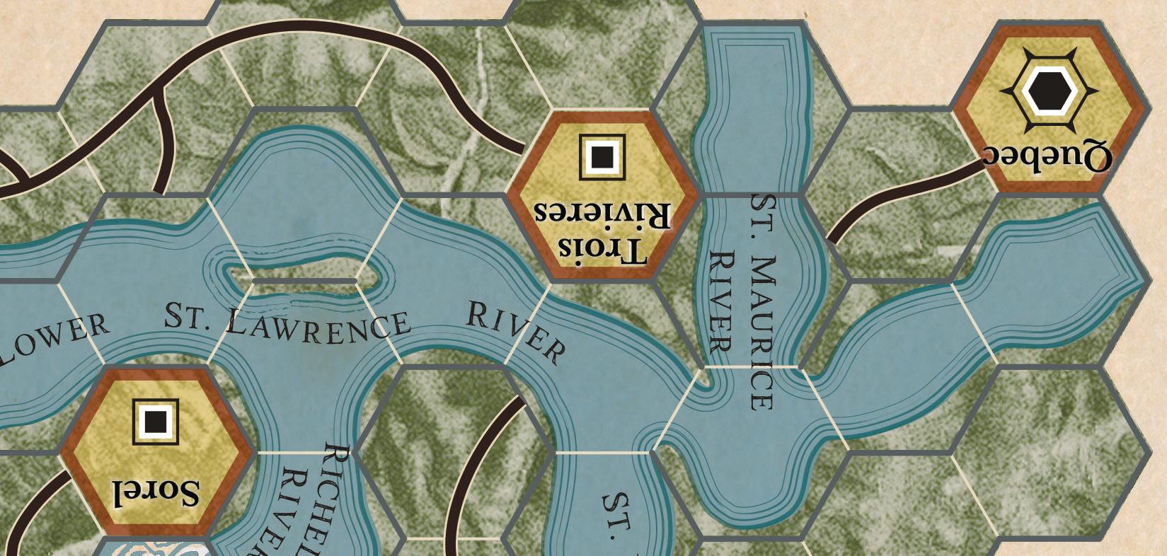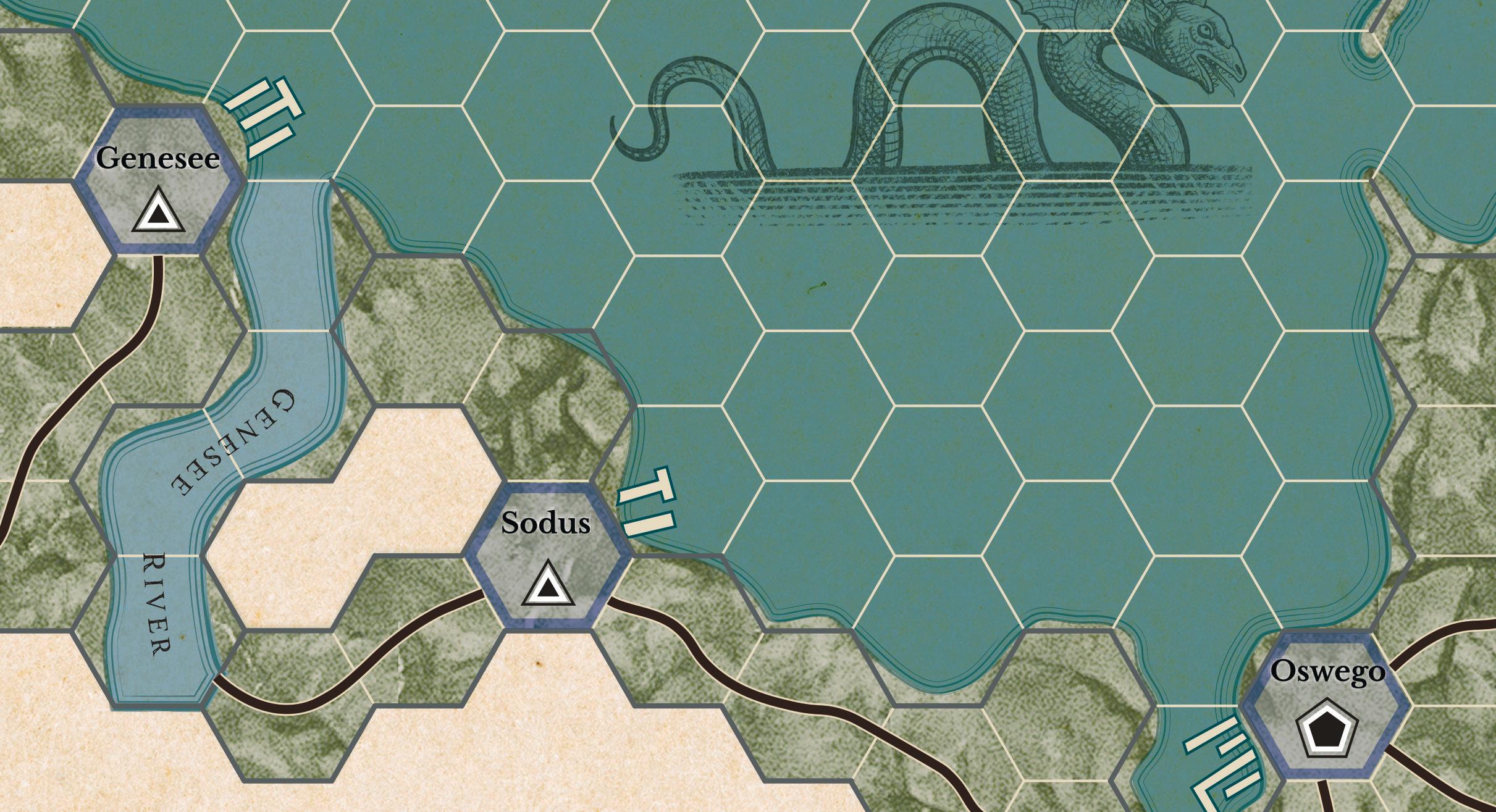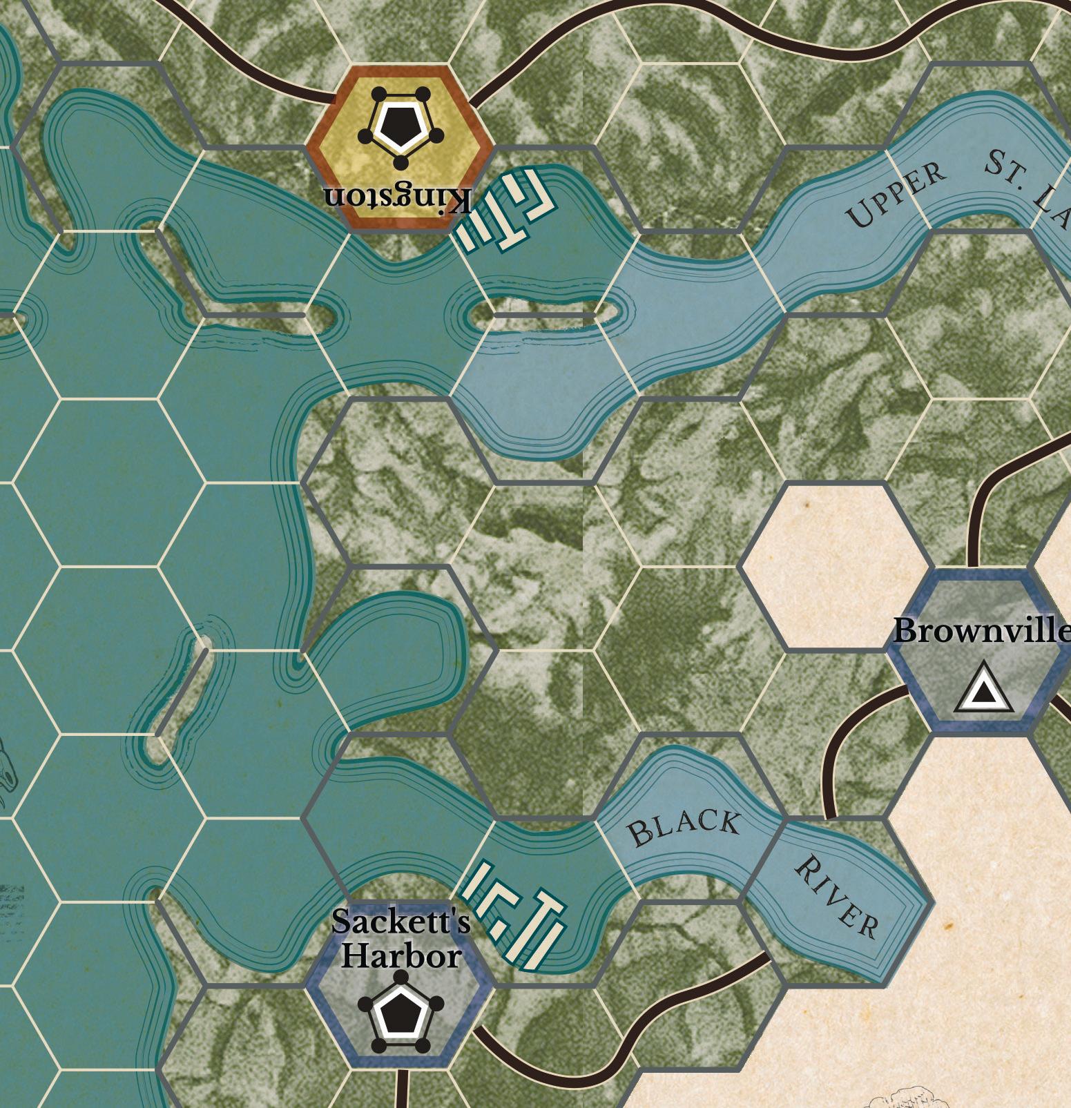 Lake and river hexes represent the Great Lakes and some of the navigable waterways feeding and linking them that existed at the time of the War.