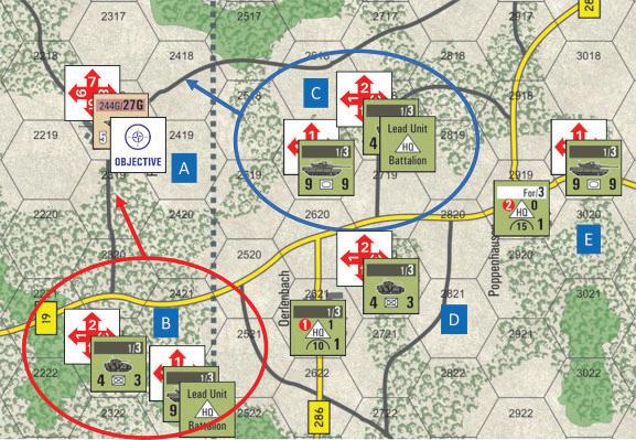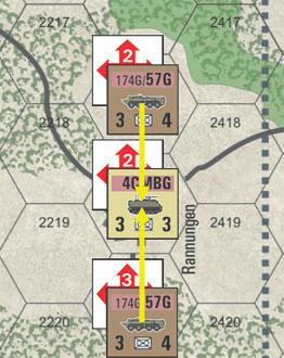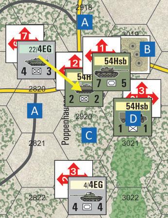 G. The task force has now reached its maximum limit of four maneuver steps, which means that any remaining unrevealed units assigned to that task force are flipped to their used sides and drop out of the task force. The NATO player must therefore flip his Marder unit to its used side.