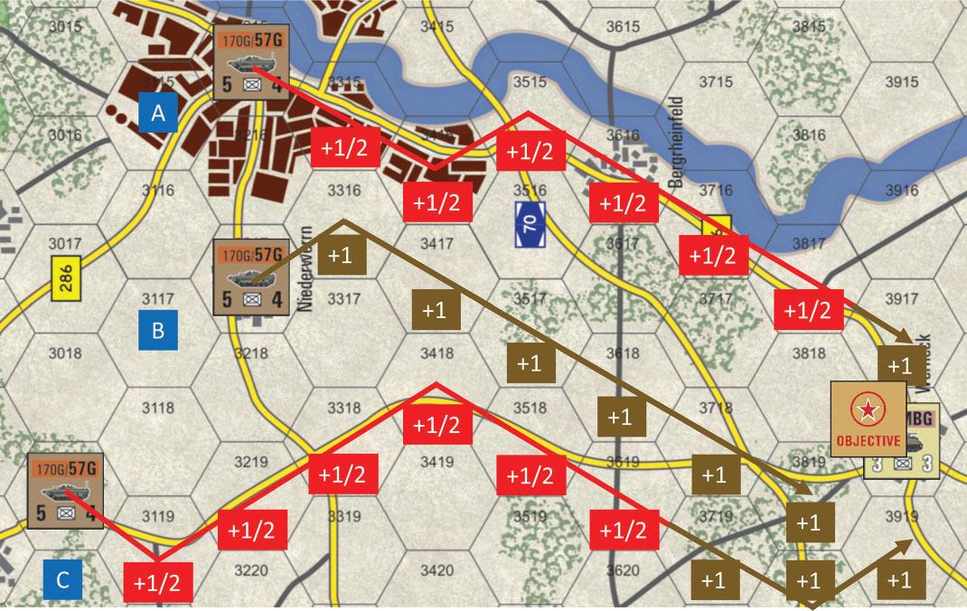 H. The NATO player combines his two units in the meeting hex into a single four-step unit and then continues the movement of his task force from hex 5225 with four MPs remaining (blue arrow). The Leopard 2 unit takes Infiltration Fire as it exits 5225 and again as it exits 5125 (yellow arrows) but both shots miss. The unit halts in hex 5026 adjacent to the Objective hex.
