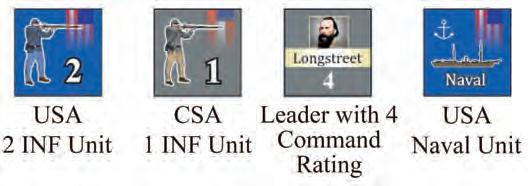 CAV units: These represent mounted forces. Union Cav has a maximum strength of “1” while Confederate Cav has a maximum strength of “2”.