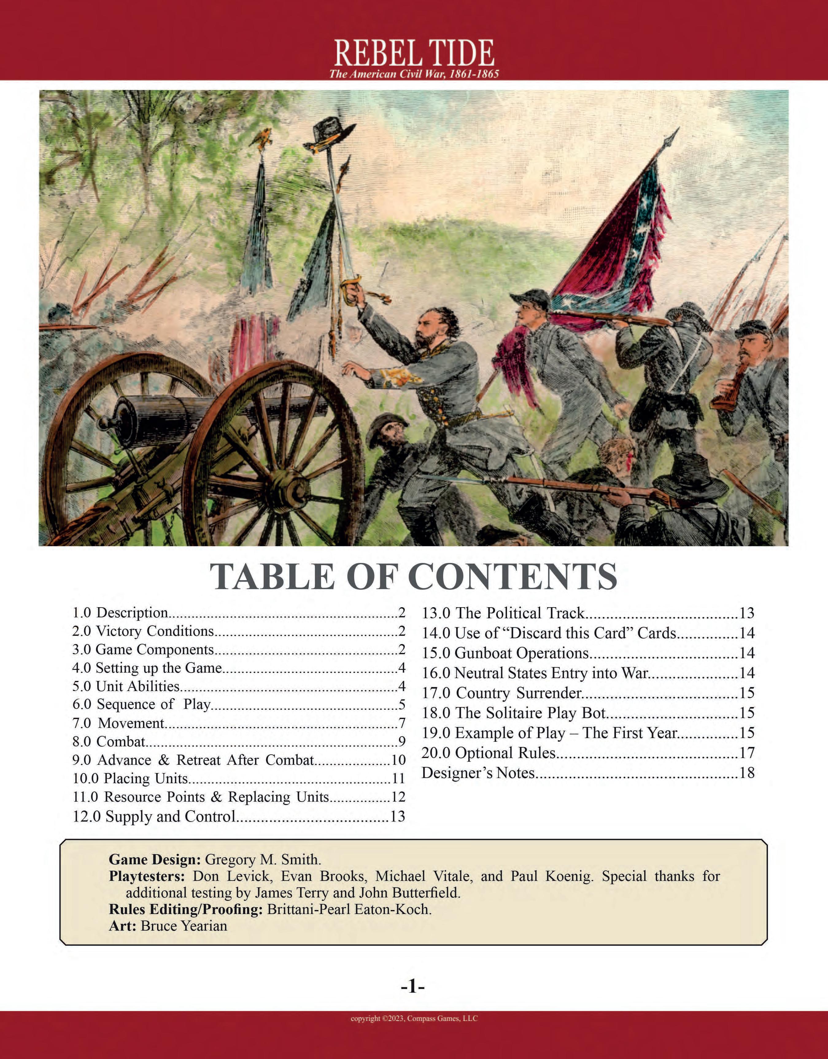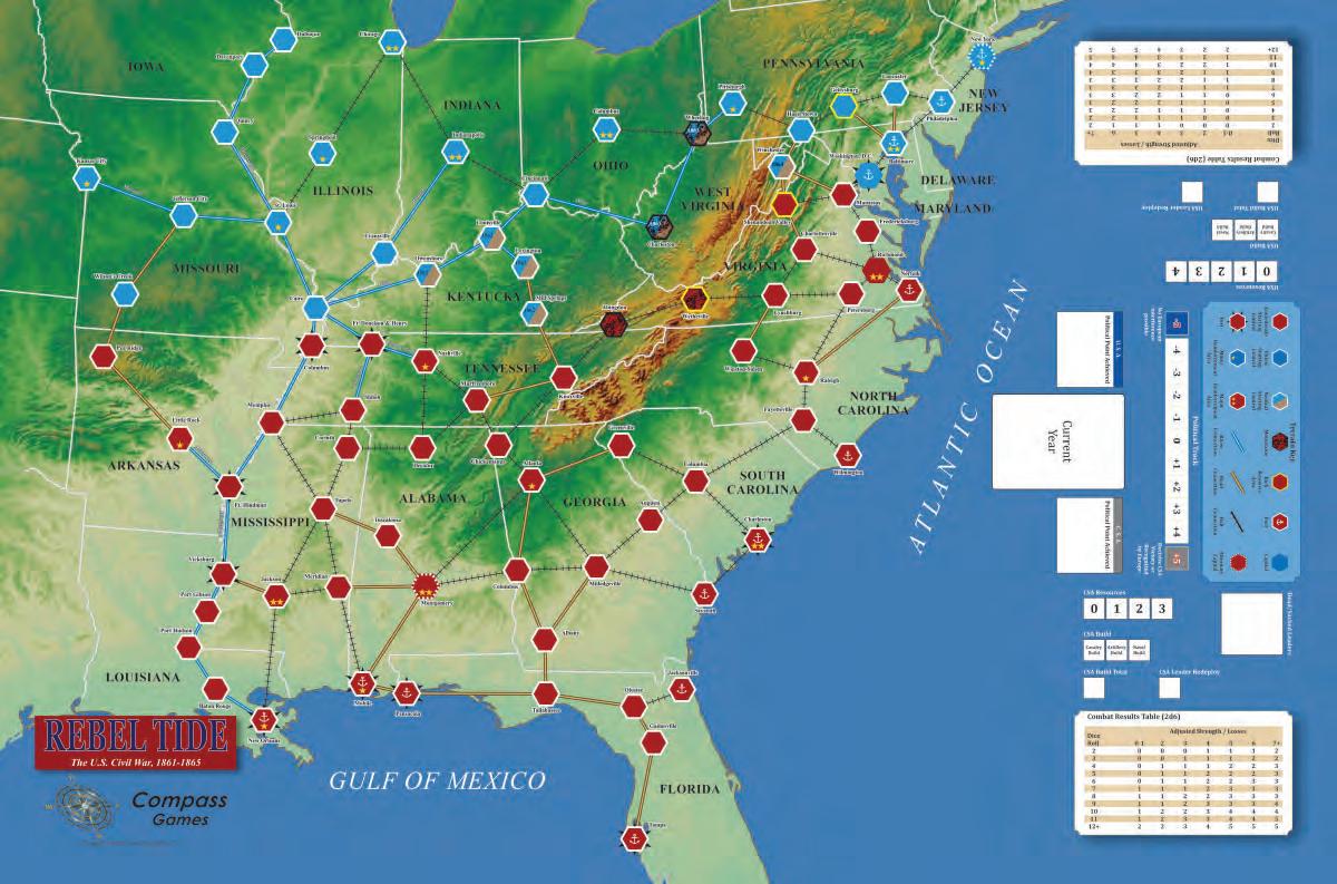 Rebel Tide is a two-player game that simulates the war between the United States of America and the Confederate States of America on a strategic scale. The game is five turns long, with each turn lasting one year (less for 1861 and 1865). Certain aspects of the war have been abstracted in order to keep the game quick and playable in an evening, but the major events of the Civil War are represented.