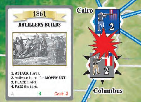 3. ART. Artillery has the disadvantage of being forced to retreat if alone in an area and an enemy INF or CAV moves there, but has the advantage of being part of a combined arms bonus. They may move two areas when activated.