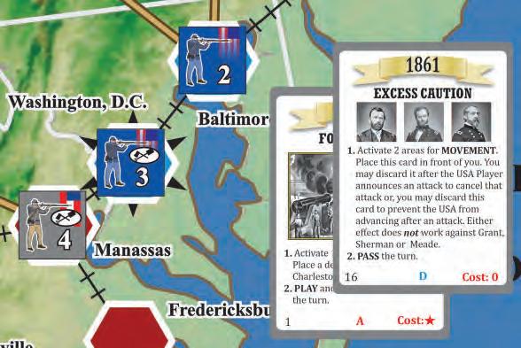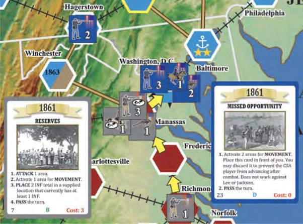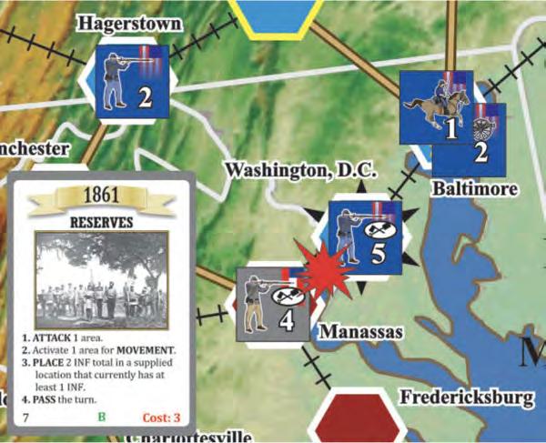 All units that cannot trace a path free of enemy units or enemy controlled areas back to a starting controlled reinforcement area (of any type) or capital city (Richmond, Washington D.C.) are considered out of supply. Out of supply units may not attack, but move and defend normally. Supply is traced at the start of each card play (or Resource Point use.) If a capital city has been taken by the enemy, the alternate capital can be used (Montgomery, New York.) Place an “Out of Supply” marker on affected units.