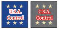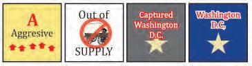 Control marker: These markers are placed to indicate control of an area. Both sides start with control of all areas inside of the states that are part of their side. The markers should be placed on areas that have switched control to the opposing power. If an area is subsequently “liberated”, simply remove the other side’s control marker.